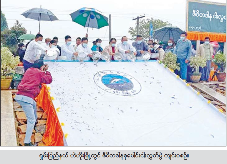 အလားတူ ရှမ်းပြည်နယ် ကျိုင်းတုံခရိုင်ငါးလုပ် ငန်းဦးစီးဌာနမှ ကျိုင်းတုံမြို့နယ် ကျိုင်းဖောင်း ချောင်းအတွင်းသို့ ရွှေဝါငါးကြင်းနှင့် ငါးမြစ်ချင်းသားပေါက်ကောင်ရေ ၂၀၀၀၀ အား လည်းကောင်း၊ လွိုင်လင်ခရိုင်ငါးလုပ်ငန်းဦးစီးဌာနမှ လွိုင်လင်မြို့ နယ်၊ မြကန်သာကန်တော်အတွင်းသို့ ရွှေဝါငါးကြင်း နှင့် ငါးခုံးမကြီး သားပေါက်ကောင်ရေ ၃၀၀၀၀အားလည်းကောင်း၊ လင်းခေးခရိုင်ငါးလုပ်ငန်းဦးစီးဌာနမှ မိုးနဲမြို့နယ် နန်းယွန်းချောင်းအတွင်းသို့ ရွှေဝါငါးကြင်းနှင့် ငါးခုံးမကြီးသားပေါက်ကောင်ရေ ၁၀၀၀၀နှင့် မောက်မယ်မြို့နယ် နန့်တွန်ချောင်း အတွင်းသို့ ရွှေဝါငါးကြင်းနှင့် ငါးခုံးမကြီးသားပေါက်ကောင်ရေ ၁၀၀၀၀ အား လည်းကောင်း သက်ဆိုင်ရာ ခရိုင်/မြို့နယ်အဆင့် စီမံအုပ်ချုပ်ရေးကောင်စီ အဖွဲ့ဝင် များနှင့် အတူ အသီးသီး ဇီဝိတဒါန ငါးမျိုးလွှတ်ထည့်ပေးခဲ့ကြသည်။ ရှမ်းပြည်နယ် အတွင်း ဇီဝိတဒါနစုပေါင်းငါးလွှတ်ပွဲတွင် ညောင်ရွှေ ငါးလုပ်ငန်းစခန်းမှ နှစ်လက်မအရွယ် ရွှေဝါငါးကြင်း နှင့် ငါးခုံးမကြီးကောင်ရေ ၁၂၀၀၀၀ ဖြစ်ကြောင်း သိရသည်။