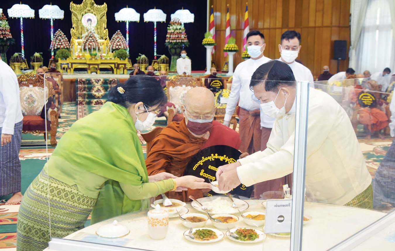 ဦးစွာ နိုင်ငံတော်စီမံအုပ်ချုပ်ရေးကောင်စီဥက္ကဋ္ဌ တပ်မတော်ကာကွယ်ရေးဦးစီးချုပ်၊ ဇနီးနှင့် ဧည့်ပရိသတ်များသည် ဘုန်းတော်ကြီး ကျောင်းအသီးသီးသို့ လှူဒါန်းရန် ခင်းကျင်းပြင်ဆင်ထား သည့် ကထိန်လျာသင်္ကန်း၊ လှူဖွယ်ပစ္စည်းများနှင့် ပဒေသာပင် များအား လှည့်လည်ကြည့်ရှုကြသည်။ ထို့နောက် နိုင်ငံတော်စီမံအုပ်ချုပ်ရေးကောင်စီဥက္ကဋ္ဌ တပ်မတော်ကာကွယ်ရေး ဦးစီးချုပ်နှင့် ဇနီးတို့သည် အနော်ရထာခန်းမအတွင်းရှိ ဗုဒ္ဓရုပ်ပွားတော်မြတ်အား ဖူးမြော်ကြည်ညို၍ မြသပိတ်ဆွမ်းတော်နှင့် ပန်း၊ သောက်တော်ရေချမ်း၊ ဆီမီး၊ သစ်သီးတို့ကို ဆက်ကပ်လှူဒါန်းသည်။