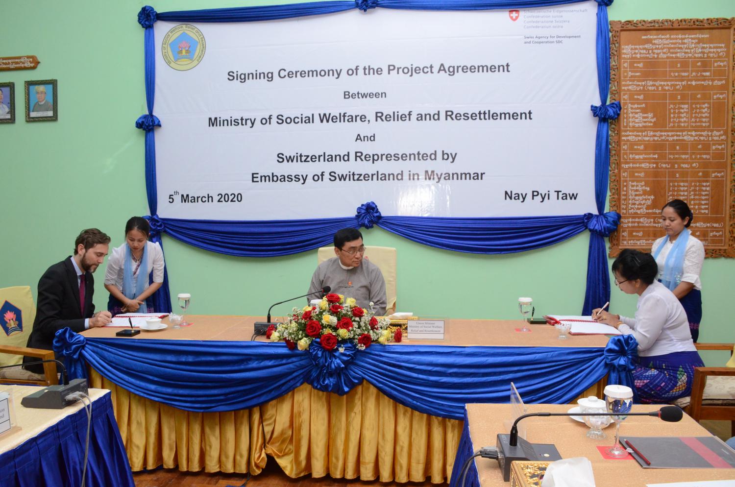 လူမှုဝန်ထမ်း၊ ကယ်ဆယ်ရေးနှင့် ပြန်လည်နေရာချထားရေးဝန်ကြီးဌာနနှင့် ဆွစ်ဇာလန် နိုင်ငံအစိုးရ ကိုယ်စားပြု မြန်မာနိုင်ငံဆိုင်ရာ ဆွစ်ဇာလန်သံရုံးတို့အကြား ရှမ်းပြည်နယ် တောင်ပိုင်း၊ လူမှုအဆောက်အဦများ တည်ဆောက်ခြင်းနှင့် ရပ်ရွာဖွံ့ဖြိုးတိုးတက်ရေး စီမံကိန်း အကောင်အထည်ဖော်ရေး သဘောတူလက်မှတ်ရေးထိုးပွဲ အခမ်းအနားကို ယမန်နေ့ညနေ ၅ နာရီခွဲက အဆိုပါဝန်ကြီးဌာန၏ အစည်းအဝေး ခန်းမ၌ ကျင်းပသည်။