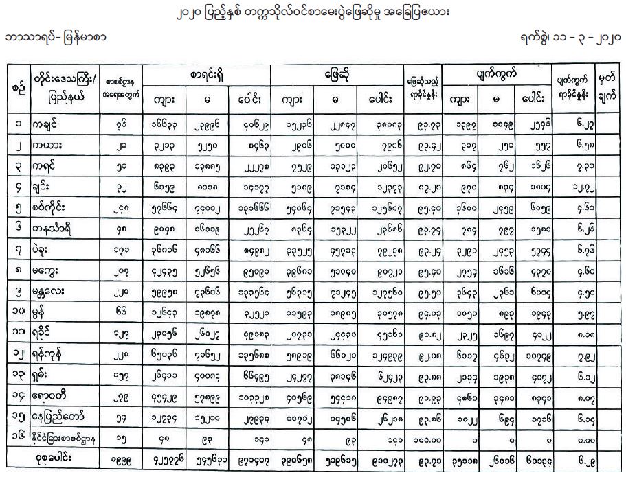 တက္ကသိုလ်ဝင်စာမေးပွဲ မြန်မာစာဘာသာရပ်တွင် ဖြေဆိုသူပေါင်း ၉၁၀၂၇၃ ဦးအနက် တစ်နိုင်ငံလုံး၌ ဆေးရုံဖြေဆိုသူ ၄၅ ဦး၊ အမြင်အာရုံ မသန်စွမ်းဖြေဆိုသူ ၃၀ ၊ အကြားအာရုံ မသန်စွမ်းဖြေဆိုသူ ၂၂ ဦး၊ ကိုယ်အင်္ဂါ မသန်စွမ်းဖြေဆိုသူ ၁၇၇ ဦး၊ အကျဉ်းထောင်များတွင် ဝင်ရောက်ဖြေဆိုသူ ၁၉၁ ဦးနှင့် ကရင်ပြည်နယ် မြဝတီမှ ဝင်ရောက်ဖြေဆိုသူ ၁၂၅ ဦးရှိကြောင်း သိရသည်။