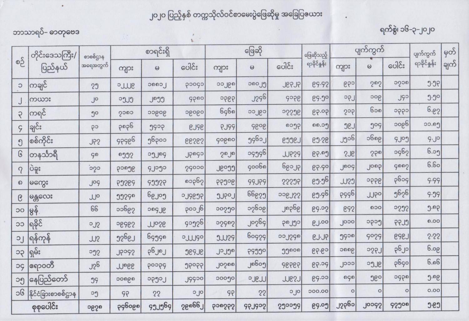 တက္ကသိုလ်ဝင်စာမေးပွဲ ဓာတုဗေဒဘာသာရပ်တွင် ဖြေဆိုသူပေါင်း ၇၅၁၁၅၄ ဦးအနက် တစ်နိုင်ငံလုံး၌ ဆေးရုံဖြေဆိုသူ ၁၃၄ ဦး၊ အကြားအာရုံမသန်စွမ်းဖြေဆိုသူ ၁၅ ဦး၊ ကိုယ်အင်္ဂါ မသန်စွမ်းဖြေဆိုသူ ၁၃၃ ဦး၊ အကျဉ်းထောင်များတွင် ဝင်ရောက်ဖြေဆိုသူ ၆၄ ဦးနှင့် ကရင် ပြည်နယ် မြဝတီမှ ဝင်ရောက်ဖြေဆိုသူ ၁၁၁ ဦးရှိ ကြောင်း သိရသည်။