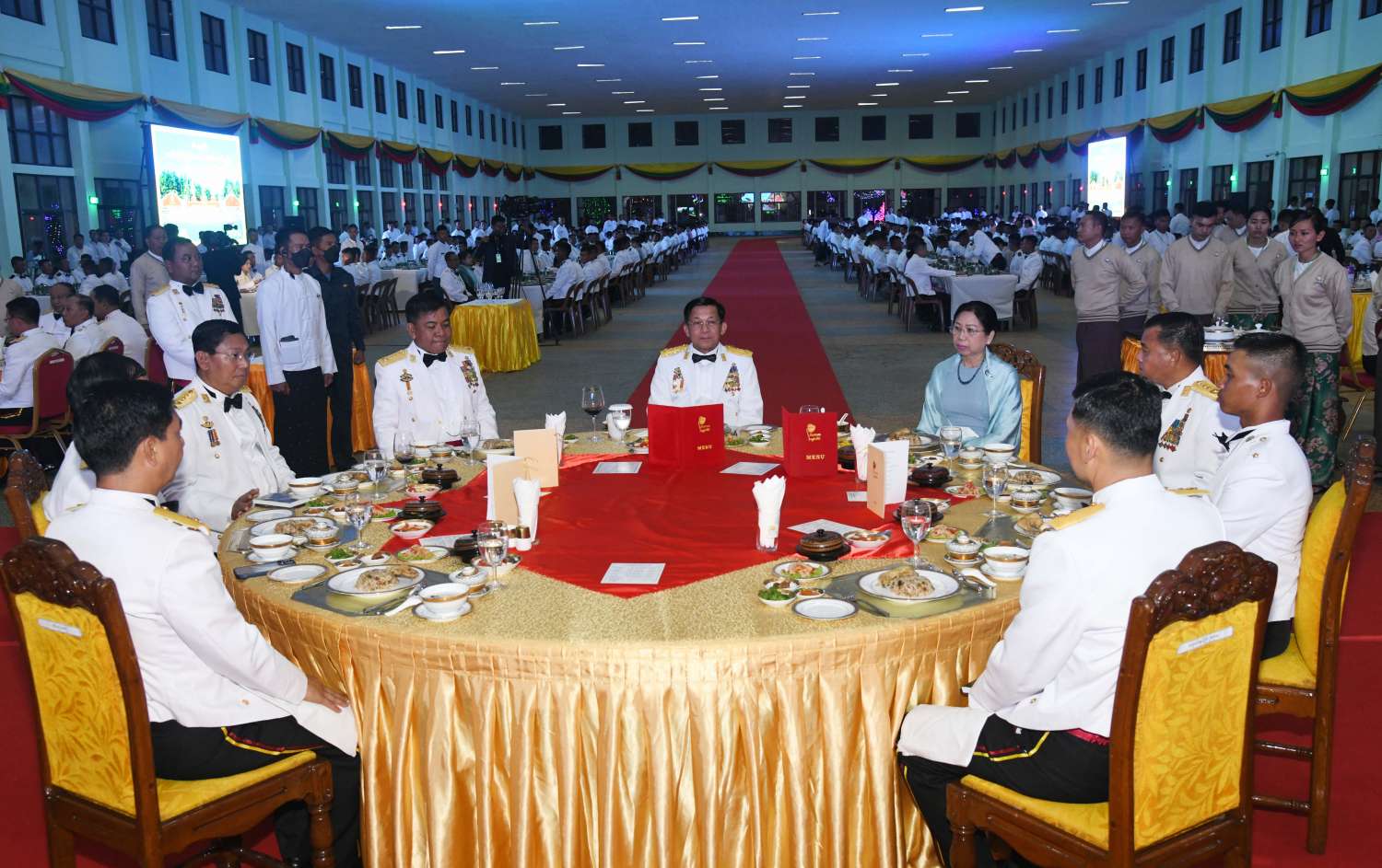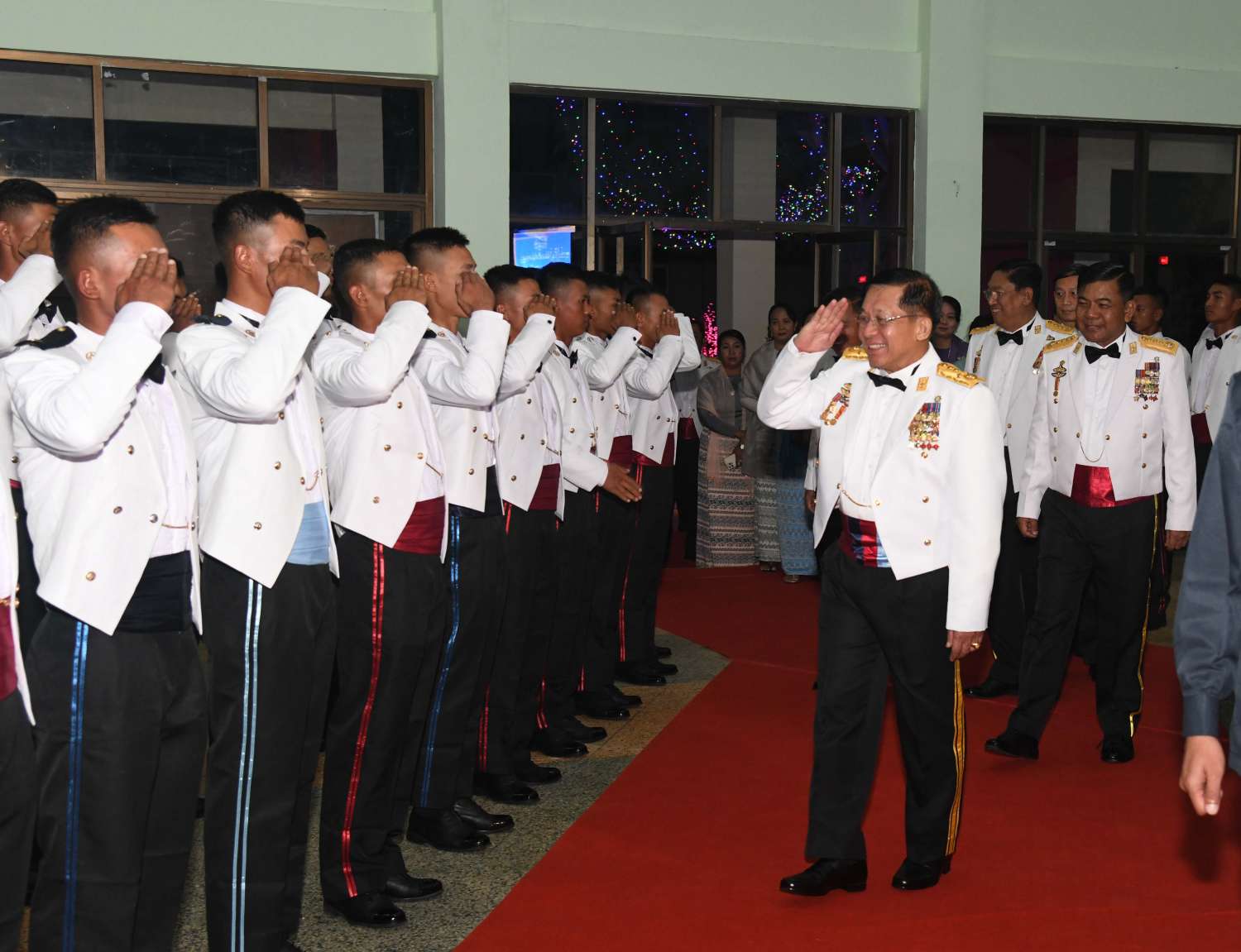 ဦးစွာ နိုင်ငံတော်စီမံအုပ်ချုပ်ရေးကောင်စီဥက္ကဋ္ဌ တပ်မတော်ကာကွယ်ရေးဦးစီးချုပ်က သင်တန်းဆင်းအရာရှိများအား တစ်ဦးချင်း ရင်းရင်းနှီးနှီး လိုက်လံနှုတ်ဆက်သည်။ ထို့နောက် နိုင်ငံတော်စီမံအုပ်ချုပ်ရေးကောင်စီဥက္ကဋ္ဌ တပ်မတော်ကာကွယ်ရေးဦးစီးချုပ်နှင့် အဖွဲ့ဝင်များသည် သင်တန်းဆင်း အရာရှိများ၊ ညစာစားပွဲ တက်ရောက်လာကြသူများနှင့်အတူ ဂုဏ်ပြုညစာကို အတူတကွ သုံးဆောင်ကြသည်။