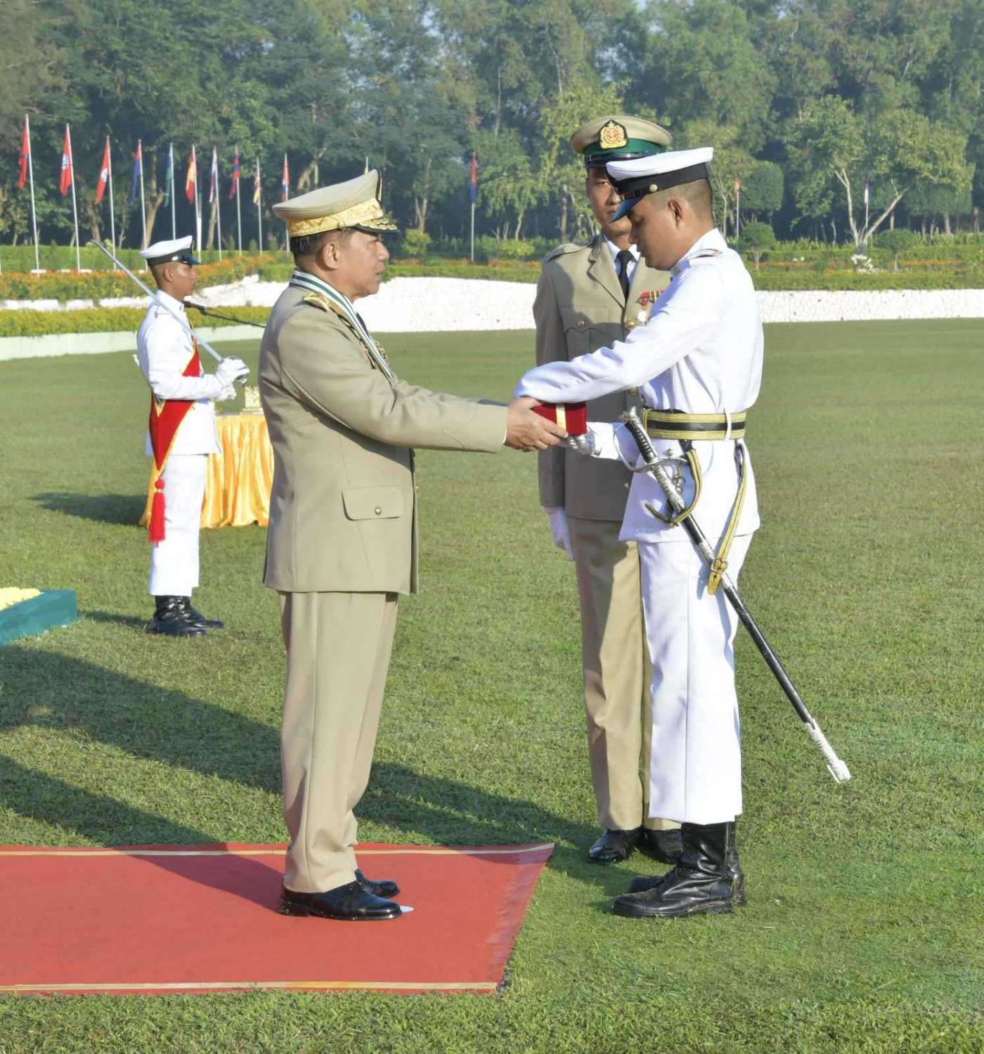 ယင်းနောက် နိုင်ငံတော်စီမံအုပ်ချုပ်ရေးကောင်စီဥက္ကဋ္ဌ တပ်မတော်ကာကွယ်ရေးဦးစီးချုပ် ဗိုလ်ချုပ်မှူးကြီး မဟာသရေစည်သူ မင်းအောင်လှိုင် က တပ်မတော်ဆေးတက္ကသိုလ် ဗိုလ်လောင်းသင်တန်း အမှတ်စဉ် (၂၃)မှ အောင်စစ်သည်ဆုရရှိသူ ဗိုလ်လောင်း ဟိန်းထွန်းဇော်၊ လေ့ကျင့်ရေးထူးချွန်ဆုရရှိသူ ဗိုလ်လောင်း မင်းခန့်ကျော်နှင့် စာပေထူးချွန်ဆုရရှိသူ ဗိုလ်လောင်း ကျော်သူရတို့အား ဆုများအသီးသီး ပေးအပ်ချီးမြှင့်သည်။