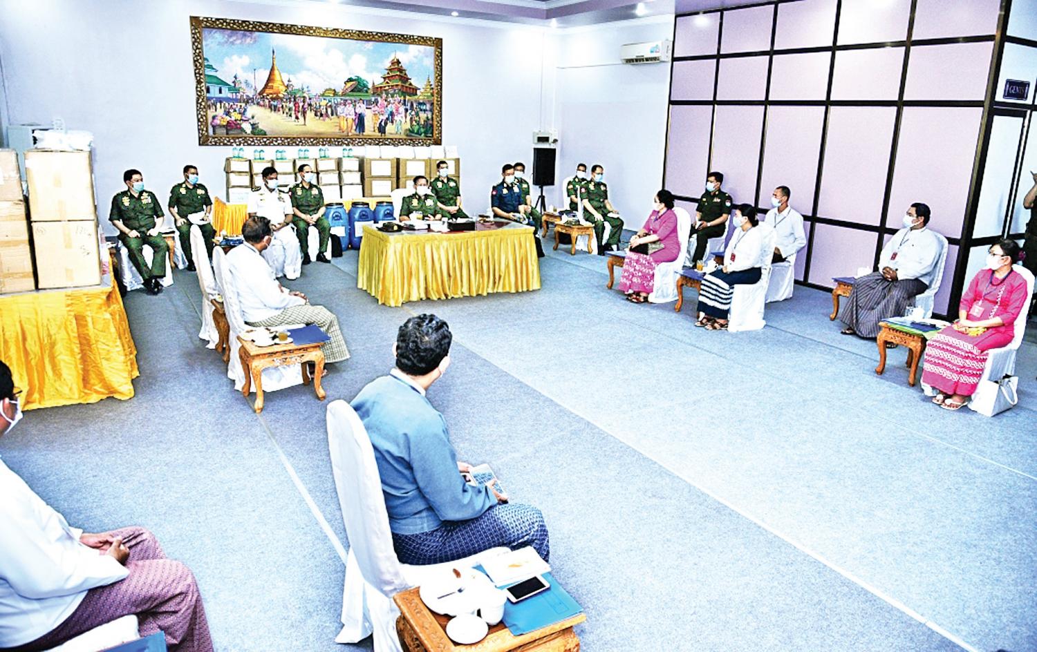 ယင်းနောက် တပ်မတော်ကာကွယ်ရေးဦးစီးချုပ် က မြို့ပြည်သူလူထုအတွက် COVID-19 ရောဂါကာကွယ်၊ ထိန်းချုပ်၊ ကုသရေး လုပ်ငန်းအထောက်အကူပြုပစ္စည်း များဖြစ်သည့် Surgical Masks အခု ၂၀၀၀၀၊ Surgical Gloves အစုံ ၃၀၀၀၊ N 95 Mask အခု ၅၀၀၊ Non-Contact Thermometer အခု ၅၀၊ Hand Gel(500 ml) ဘူး ၁၅၀၊ Hand Sanitizer(500 ml) ဘူး ၁၅၀၊ Bleaching Powder နှစ်ပုံး၊ တပ်မတော်စက်ရုံမှ ထုတ် လုပ်သည့် Masks အခု ၅၀၀၀ နှင့် စားသောက် ဖွယ်ရာများအား ထောက်ပံ့ပေးအပ်ရာ မြို့မိ၊ မြို့ဖများက လက်ခံရယူကြသည်။