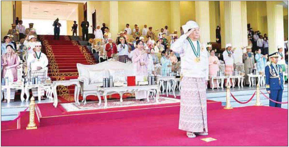 ချီတက်အလေးပြုစဉ် နိုင်ငံတော်စီမံအုပ်ချုပ်ရေးကောင်စီဥက္ကဋ္ဌ နိုင်ငံတော်ဝန်ကြီးချုပ်နှင့်ဇနီး၊ ဧည်သည်တော်များသည် ချီတက်အလေးပြုသည့် ဂုဏ်ပြုယာဉ်များ၊ သရုပ်ပြအဖွဲ့များနှင့် ဂုဏ်ပြု အကအဖွဲ့များကို ရင်းရင်းနှီးနှီး လက်ပြနှုတ်ဆက်ကြသည်။