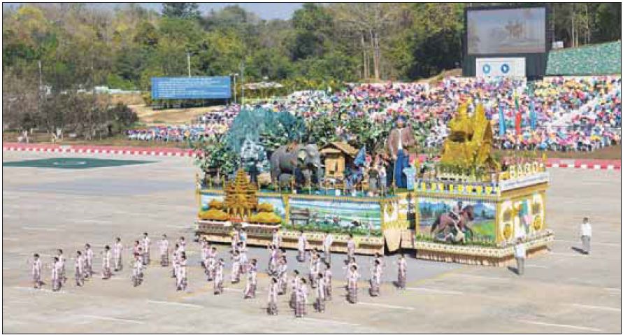 ဆက်လက်၍ မြန်မာနိုင်ငံအတွင်းရှိ တိုင်းဒေသကြီးနှင့် ပြည်နယ်တို့ရှိ ထင်ရှားသည့် အထိမ်းအမှတ်များ၊ လူနေမှုစရိုက်လက္ခဏာများ၊ ဓလေ့ထုံးတမ်း အစဉ်အလာများနှင့် ထုတ်ကုန်များကို သရုပ်ဖော်ပြသထားသည့် နေပြည်တော်ကောင်စီနယ်မြေ၊ ကချင်ပြည်နယ်၊ ကယားပြည်နယ်၊ ကရင်ပြည်နယ်၊ ချင်းပြည်နယ်၊ စစ်ကိုင်းတိုင်းဒေသကြီး၊ တနင်္သာရီတိုင်း ဒေသကြီး၊ ပဲခူးတိုင်းဒေသကြီး၊ မကွေးတိုင်းဒေသကြီး၊ မန္တလေးတိုင်းဒေသကြီး၊ မွန်ပြည်နယ်၊ ရခိုင်ပြည်နယ်၊ ရန်ကုန်တိုင်းဒေသကြီး၊ ရှမ်းပြည်နယ်၊ ဧရာဝတီတိုင်းဒေသကြီးတို့မှ ဂုဏ်ပြုယာဉ်များနှင့် ဖျော်ဖြေရေးအဖွဲ့များက တေးသီချင်းအကအလှများဖြင့်လည်းကောင်း၊ ပြည်ထဲရေးဝန်ကြီးဌာန၊ နိုင်ငံခြားရေးဝန်ကြီးဌာနနှင့် အပြည်ပြည်ဆိုင်ရာ ပူးပေါင်းဆောင် ရွက်ရေးဝန်ကြီးဌာန၊ နယ်စပ်ရေးရာဝန်ကြီးဌာန၊ စီမံကိန်းနှင့်ဘဏ္ဍာရေးဝန်ကြီးဌာန၊ ရင်းနှီးမြှုပ်နှံမှုနှင့် နိုင်ငံခြားစီးပွားဆက်သွယ်ရေးဝန်ကြီးဌာန၊ ဥပဒေရေးရာဝန်ကြီးဌာန၊ ပြန်ကြားရေးဝန်ကြီးဌာန၊ သာသနာရေးနှင့် ယဉ်ကျေးမှုဝန်ကြီးဌာန၊ စိုက်ပျိုးရေး၊ မွေးမြူရေးနှင့် ဆည်မြောင်းဝန်ကြီးဌာန၊ သမဝါယမနှင့် ကျေးလက်ဖွံ့ဖြိုးရေးဝန်ကြီးဌာန၊ ပို့ဆောင်ရေးနှင့် ဆက်သွယ်ရေးဝန်ကြီးဌာန၊ သယံဇာတနှင့်သဘာဝပတ်ဝန်းကျင်ထိန်းသိမ်းရေးဝန်ကြီးဌာန၊ လျှပ်စစ်စွမ်းအားဝန်ကြီးဌာန၊ စွမ်းအင်ဝန်ကြီးဌာန၊ စက်မှုဝန်ကြီးဌာန၊ လှုဝင်မှုကြီးကြပ်ရေးနှင့် ပြည်သူ့အင်အားဝန်ကြီးဌာန၊ အလုပ်သမားဝန်ကြီးဌာန၊ စီးပွားရေးနှင့် ကူးသန်းရောင်းဝယ်ရေး ဝန်ကြီးဌာန၊ ပညာရေးဝန်ကြီးဌာန၊ သိပ္ပံနှင့်နည်းပညာဝန်ကြီးဌာန၊ ကျန်းမာရေးဝန်ကြီးဌာန၊ အားကစားနှင့်လူငယ်ရေးရာဝန်ကြီးဌာန၊ ဆောက်လုပ်ရေးဝန်ကြီးဌာန၊ လူမှုဝန်ထမ်း၊ ကယ်ဆယ်ရေးနှင့် ပြန်လည်နေရာချထားရေးဝန်ကြီးဌာန၊ ဟိုတယ်နှင့်ခရီးသွားလာရေးဝန်ကြီး ဌာန၊ တိုင်းရင်းသားလူမျိုးများရေးရာဝန်ကြီးဌာနတို့မှ ဂုဏ်ပြုယာဉ်များက ဝန်ကြီးဌာနအလိုက် ဆောင်ရွက်မှုလုပ်ငန်းစဉ်များကို သရုပ်ဖော်ပြသ၍လည်းကောင်း ချီတက်သရုပ်ပြ ဖျော်ဖြေတင်ဆက်ကြသည်။