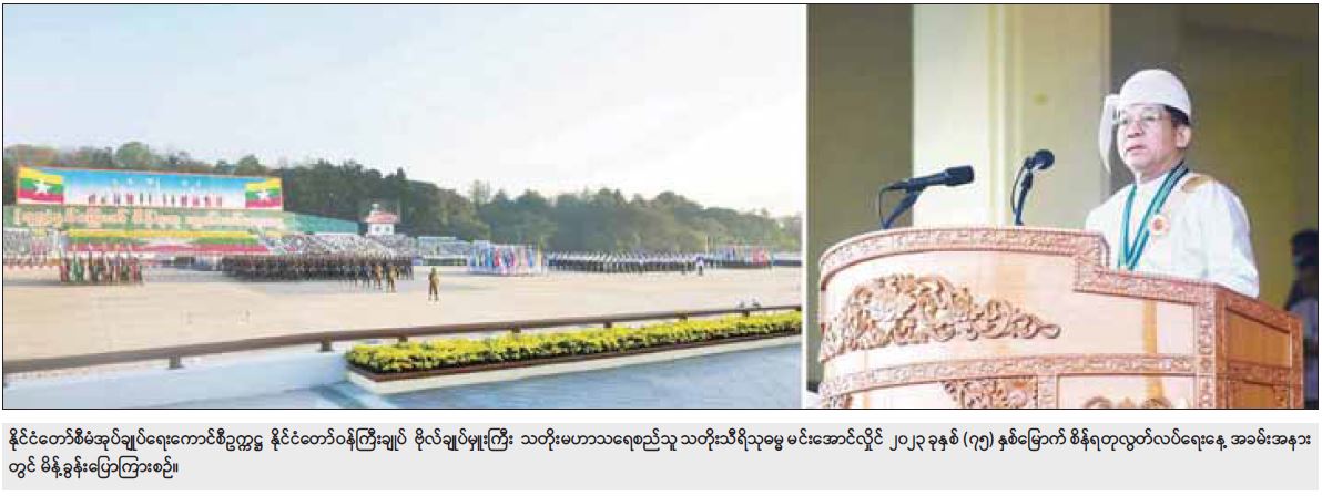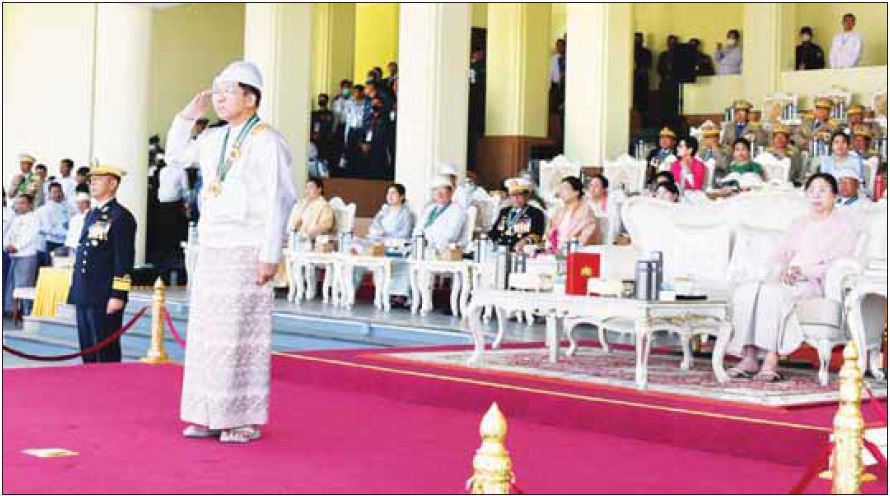 ထို့နောက် နိုင်ငံတော်စီမံအုပ်ချုပ်ရေးကောင်စီဥက္ကဋ္ဌ နိုင်ငံတော်ဝန်ကြီးချုပ် ဗိုလ်ချုပ်မှူးကြီး သတိုးမဟာသရေစည်သူ သတိုးသီရိသုဓမ္မ မင်းအောင်လှိုင်သည် စစ်ရေးပြတပ်ရင်း၊ ဂုဏ်ပြုယာဉ် များ၊ တပ်မတော်နှင့် ပြည်ထဲရေးမှ ယန္တရားတပ်ခွဲများကို မော်တော်ယာဉ်ဖြင့် ကြည့်ရှုစစ်ဆေးသည်။