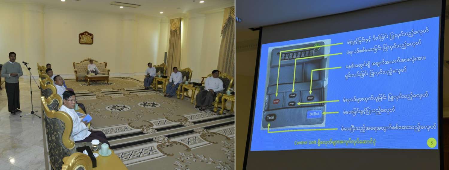 ဦးစွာ ပြည်ထောင်စုရွေးကောက်ပွဲကော်မရှင်မှ တာဝန်ရှိသူတစ်ဦးက Myanmar Electronic Voting Maching (MEVM) စမ်းသပ်တည်ဆောက်ထားရှိမှုနှင့်ပတ်သက်၍ ထိန်းချုပ်စက် (Control Unit)၊ ဆန္ဒပြုစက် (Ballonting Unit – Main, Extension)၊ ဆန္ဒပြုစက်မှန်ကန်မှု ရှိ/မရှိ ပြသသောစက် (Verification Unit)၊ မဲပုံးနှင့်ဘထ္ထရီများ ဖွဲ့စည်းတည်ဆောက်ထားရှိမှု၊ ထည့်သွင်းအသုံးပြုထားသည့်စက်များနှင့် အသုံးပြုရခြင်းရည်ရွယ်ချက်များ၊ သုံးသပ်အကြံပြုတင်ပြချက်များ၊ အရေအတွက်အများအပြားထုတ်လုပ်ရန်အတွက် ပြင်ဆင်ရမည့်အချက်များ၊ လိုအပ်ချက်များနှင့်ပတ်သက်၍ ရှင်းလင်းတင်ပြသည်။