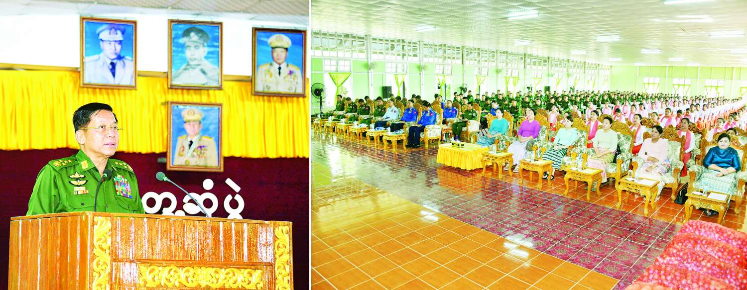 ထို့နောက် နိုင်ငံတော်စီမံအုပ်ချုပ်ရေးကောင်စီဥက္ကဋ္ဌ တပ်မတော်ကာကွယ်ရေးဦးစီးချုပ်က နိုင်ငံတော်တွင်ဖြစ်ပေါ်ခဲ့သည့် အခြေအနေများနှင့် မည်သည့်အစိုးရကအုပ်ချုပ်သည်ဖြစ်စေ တပ်မတော်အနေဖြင့် နိုင်ငံတော်နှင့် ပြည်သူလူထု၏ အကျိုးစီးပွားကိုသာ အစဉ်ဦးထိပ်ထား၍ ဆောင်ရွက်လျက်ရှိသည့် အခြေအနေများကို အရာရှိ၊ စစ်သည်၊ မိသားစုသိရှိနိုင်ရန် ယခုကဲ့သို့ အကျယ်တဝင့် ရှင်းလင်းပြောကြားခဲ့ခြင်းဖြစ်ကြောင်း၊ တပ်မတော်သားများအနေဖြင့် မိမိတို့ တစ်ဦးတစ်ယောက်ချင်းစီ၏ ကိုယ်ရည်ကိုယ်သွေးများမြင့်တက်လာစေရေး စဉ်ဆက်မပြတ် ကြိုးစားအားထုတ်နေရမည်ဖြစ်ကြောင်း၊ တပ်မတော်အနေဖြင့် စစ်သည်တစ်ဦးချင်း၏ အရည်အသွေးများမြင့်မားစေရေး၊ အဆင့်နှင့်လျော်ညီသည့် အတတ်ပညာနှင့် ပညာရပ်များရရှိစေရေး သက်ဆိုင်ရာအဆင့်အလိုက် သင်တန်းများဖွင့်လှစ်သင်ကြားပေးလျက်ရှိသကဲ့သို့ စစ်သည်များအနေဖြင့်လည်း ကြိုးစားအားထုတ်ကြရမည်ဖြစ်ကြောင်း၊ စစ်စည်းကမ်းသည် တပ်မတော်၏ ကျောရိုးဖြစ်ကာ စည်းကမ်းလိုက်နာမှုရှိပြီး အမိန့်နာခံမှုရှိမှသာလျှင် စစ်သားကောင်းတစ်ယောက်ပီသမည်ဖြစ်ကြောင်း၊ နိုင်ငံတော်၏လုံခြုံရေးနှင့် ကာကွယ်ရေးတာဝန်များကို ထမ်းဆောင်ရာတွင် အမိန့်နာခံမှုရှိခြင်းသည် အလွန်အရေးကြီးပြီး စည်းကမ်းကောင်းမွန်ရန်လည်း လိုအပ်မည်ဖြစ်ကြောင်း၊ စည်းကမ်းကောင်းမွန်ခြင်းသည် အမိန့်နာခံမှုရှိခြင်းပင်ဖြစ်ကြောင်း၊ စည်းကမ်းများထုတ်ပြန်ထားရှိခြင်းသည် မည်သည့်လုပ်ငန်းကိုမဆို စည်းစနစ်တကျ ဆောင်ရွက်တတ်စေရန်နှင့် မဖြစ်သင့်သည်များကိုမဖြစ်စေရန် ထုတ်ပြန်ထားခြင်းဖြစ်ပြီး အကြောင်းမဲ့တင်းကြပ်ထားခြင်းမဟုတ်သည်ကို နားလည်သဘောပေါက်ရန်လိုကြောင်း၊ စည်းကမ်းလိုက်နာခြင်းဖြင့် မိမိကိုယ်ကိုမြှင့်တင်ရမည်ဖြစ်ကြောင်း။