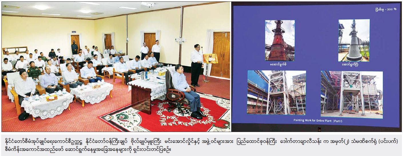 ရှင်းလင်းတင်ပြမှုများအပေါ် နိုင်ငံတော်စီမံအုပ်ချုပ်ရေးကောင်စီ ဥက္ကဋ္ဌ နိုင်ငံတော်ဝန်ကြီးချုပ်က နိုင်ငံတည်ဆောက်ရေးတွင် သံမဏိသည် မဖြစ်မနေလိုအပ်သည့် ပစ္စည်းဖြစ်ပြီး ပြည်တွင်းသံမဏိ လိုအပ်ချက်များစွာရှိသဖြင့် သံမဏိထုတ်လုပ်ရေးစီမံကိန်းများအား အောင်မြင်အောင် အကောင်အထည်ဖော် ဆောင်ရွက်ရမည်ဖြစ်ကြောင်း၊ နိုင်ငံတစ်နိုင်ငံ ဖွံ့ဖြိုးတိုးတက်ရေးအတွက် အခြေခံလိုအပ်ချက် တစ်ခုဖြစ်သည့် သံ၊ သံမဏိ ထုတ်ကုန်များကို ပြည်ပသွင်းကုန်အဖြစ် တင်သွင်းရန်မလိုဘဲ ပြည်တွင်းလိုအပ်ချက်ကို ဖြည့်ဆည်းပေးနိုင်မည်ဖြစ်ပြီး အလုပ်အကိုင် အခွင့်အလမ်းများ ဖန်တီးပေးနိုင်ခြင်း၊ ခိုင်မာသည့် ဈေးကွက်ရှိခြင်းတို့ကြောင့် မဖြစ်မနေ အောင်မြင် အောင် အကောင်အထည်ဖော်ဆောင်ရန်လိုအပ်သည့် စီမံကိန်းတစ်ခုဖြစ်ကြောင်း၊ ယခုစီမံကိန်းကို ငွေကြေးအခက်အခဲ၊ နည်းပညာအခက်အခဲများကြားမှ အကောင်အထည်ဖော်ဆောင်ခဲ့ရခြင်း ဖြစ်သော်လည်း စီမံကိန်းအပေါ် နားလည်မှုနှင့် မဟာဗျူဟာမြောက်အမြင်မရှိဘဲ စီမံကိန်းကို ၂၀၁၇ ခုနှစ်တွင် ရပ်ဆိုင်းခဲ့၍ နိုင်ငံတော်အတွက် များစွာနစ်နာခဲ့ရကြောင်း၊ ခေတ်မီနိုင်ငံတစ်ခု တည်ဆောက်ရေးအတွက် သံမဏိလိုအပ်ချက်သည် မလွဲမသွေ ရှိနေမည်ဖြစ်ကြောင်း။