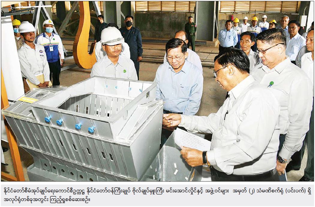 ထို့နောက် နိုင်ငံတော်စီမံအုပ်ချုပ်ရေးကောင်စီဥက္ကဋ္ဌ နိုင်ငံတော်ဝန်ကြီးချုပ်နှင့် အဖွဲ့ဝင်များသည် စက်ရုံအတွင်းလှည့်လည်၍ သံသတ္တုရိုင်းပြုပြင်ရေးအလုပ်ရုံ၊ ကုန်ကြမ်းသိုလှောင်ဖြန့်ဖြူးရေး အလုပ်ရုံ၊ စွန့်ပစ်အပူသုံးလျှပ်စစ်ဓာတ်အားပေးအလုပ်ရုံ၊ သံရည်ကျိုအလုပ်ရုံ၊ သံစိမ်းတုံးပုံလောင်း အလုပ်ရုံ၊ သံစိမ်းတုံးသိုလှောင်သည့်နေရာ၊ ဖိအားမြင့် လေထုတ်အလုပ်ရုံတို့ကို ကြည့်ရှုစစ်ဆေးခဲ့ပြီး တာဝန်ရှိသူများ၏ တင်ပြချက်များအပေါ် လိုအပ်သည်များ ညှိနှိုင်းဖြည့်ဆည်း ဆောင်ရွက်ပေးသည်။ ယင်းနောက် နိုင်ငံတော်စီမံအုပ်ချုပ်ရေးကောင်စီဥက္ကဋ္ဌ နိုင်ငံတော်ဝန်ကြီးချုပ်က စက်ရုံဝန်ထမ်းများ အတွက် ချီးမြှင့်ငွေများကိုပေးအပ်ရာ တာဝန်ရှိသူများက လက်ခံရယူခဲ့ကြသည်။