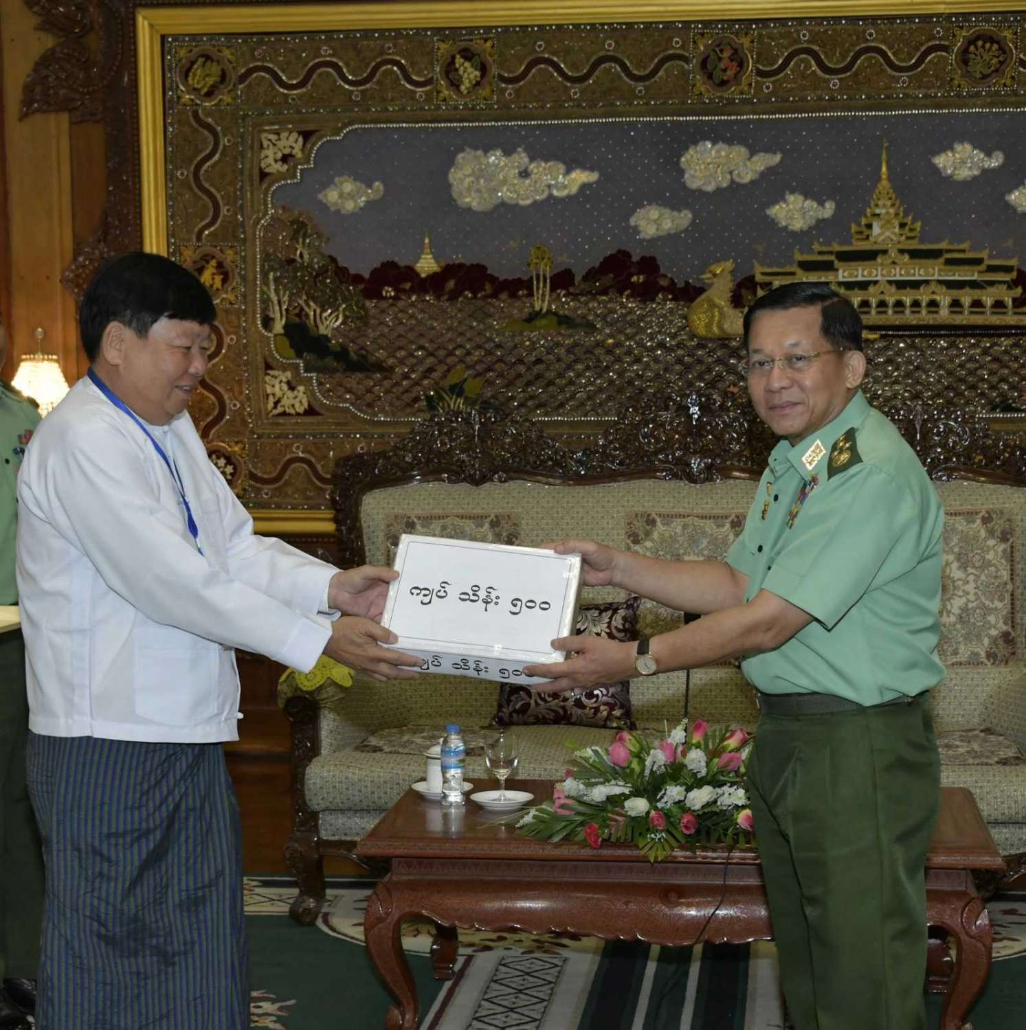 ထို့နောက် မုန်တိုင်းဒဏ်သင့်ခဲ့ရသည့်ဒေသများ၌ ကူညီကယ်ဆယ်ရေးနှင့် ပြန်လည်ထူထောင်ရေးလုပ်ငန်းများ ဆောင်ရွက်ရာတွင် အသုံးပြုနိုင်ရေး စေတနာရှင်၊ အလှူ ရှင်များက အလှူငွေများကို ပေးအပ်လှူဒါန်းကြရာ တပ်မတော်(ကြည်း၊ ရေ၊ လေ) အရာရှိ၊ စစ်သည်၊ မိသားစုများကိုယ်စား စစ်ရေးချုပ် ဒုတိယဗိုလ်ချုပ်ကြီး စိုးမင်းဦးက အလှူငွေကျပ် သိန်း ၁၀၀၀၀ ကို ပေးအပ်လှူဒါန်းရာ နိုင်ငံတော်စီမံအုပ်ချုပ်ရေးကောင်စီဥက္ကဋ္ဌ နိုင်ငံတော်ဝန်ကြီးချုပ်က လက်ခံရယူသည်။