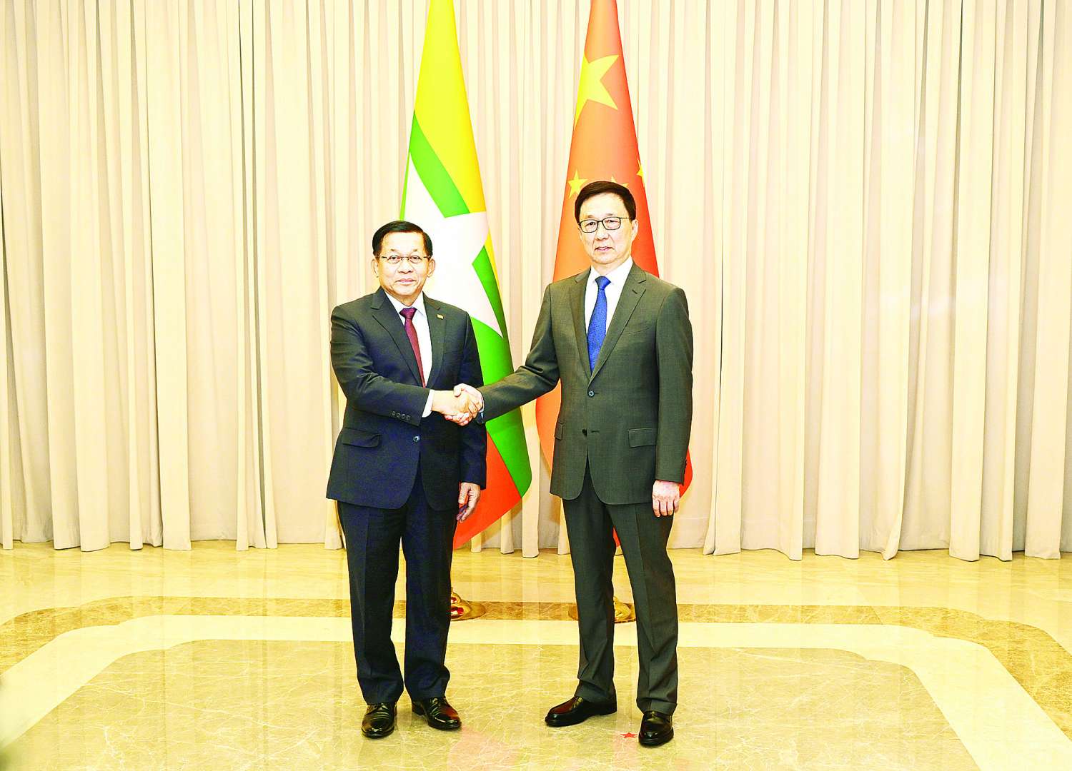 တရုတ်ပြည်သူ့သမ္မတနိုင်ငံ ပေကျင်းမြို့တွင် အလုပ်သဘောခရီးရောက်ရှိနေသည့် ပြည်ထောင်စုသမ္မတမြန်မာနိုင်ငံတော် ယာယီသမ္မတ နိုင်ငံတော်လုံခြုံရေးနှင့် အေးချမ်းသာယာရေးကော်မရှင်ဥက္ကဋ္ဌ ဗိုလ်ချုပ်မှူးကြီး မင်းအောင်လှိုင်သည် ယနေ့ဒေသစံတော်ချိန် မွန်းတည့် ၁၂ နာရီတွင် ကျောက်ယွိထိုင်နိုင်ငံတော်ဧည့်ဂေဟာ၌ တရုတ်ပြည်သူ့သမ္မတနိုင်ငံ၊ ဒုတိယသမ္မတ H.E. Mr. Han Zheng နှင့် တွေ့ဆုံဆွေးနွေးသည်။