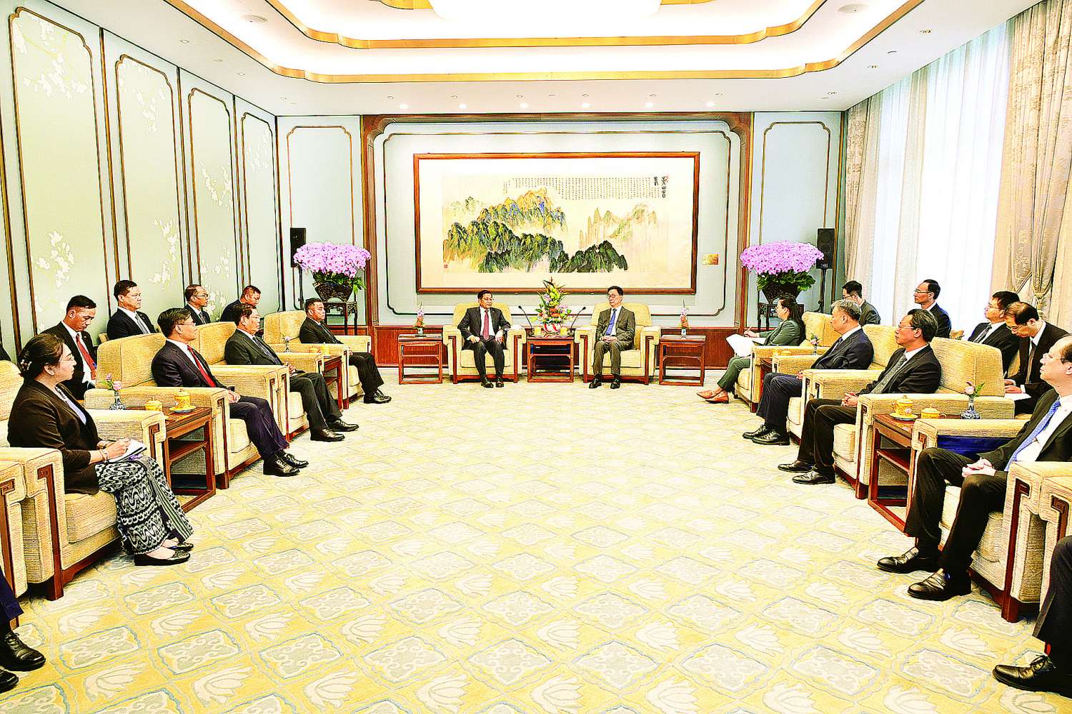 ထို့နောက် တွေ့ဆုံပွဲအခမ်းအနားကိုကျင်းပရာ ပြည်ထောင်စုသမ္မတမြန်မာနိုင်ငံတော် ယာယီသမ္မတ နိုင်ငံတော်လုံခြုံရေးနှင့်အေးချမ်းသာယာရေးကော်မရှင်ဥက္ကဋ္ဌနှင့်အတူ ကော်မရှင်အတွင်းရေးမှူး၊ တွဲဖက်အမှုဆောင်ချုပ် ဗိုလ်ချုပ်ကြီး ရဲဝင်းဦး၊ ကော်မရှင်အဖွဲ့ဝင် နိုင်ငံခြားရေးဝန်ကြီးဌာန ပြည်ထောင်စုဝန်ကြီး ဦးသန်းဆွေ၊ ကော်မရှင်အဖွဲ့ဝင် ညှိနှိုင်းကွပ်ကဲရေးမှူး(ကြည်း၊ ရေ၊ လေ) ဗိုလ်ချုပ်ကြီး ကျော်စွာလင်း၊ ပြည်ထောင်စုဝန်ကြီးများ ဖြစ်ကြသည့် ဒေါက်တာ ဝါဝါမောင်၊ ဦးမင်းနောင်၊ ဦးချစ်ဆွေ၊ တရုတ်ပြည်သူ့သမ္မတနိုင်ငံဆိုင်ရာ မြန်မာနိုင်ငံသံအမတ်ကြီး ဦးတင်မောင်ဆွေ၊ ခရီးစဉ်တွင်လိုက်ပါလာသည့် ဒုတိယဝန်ကြီးများနှင့် တာဝန်ရှိသူများ တက်ရောက်ကြပြီး တရုတ်ပြည်သူ့သမ္မတနိုင်ငံ ဒုတိယသမ္မတနှင့် တရုတ်ပြည်သူ့သမ္မတနိုင်ငံအစိုးရအဖွဲ့မှ တာဝန်ရှိသူများ၊ မြန်မာနိုင်ငံဆိုင်ရာ တရုတ်နိုင်ငံသံအမတ်ကြီး H.E. Ms. Ma Jia နှင့် တာဝန်ရှိသူများ တက်ရောက်ကြသည်။