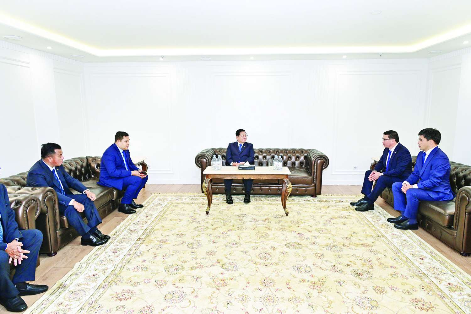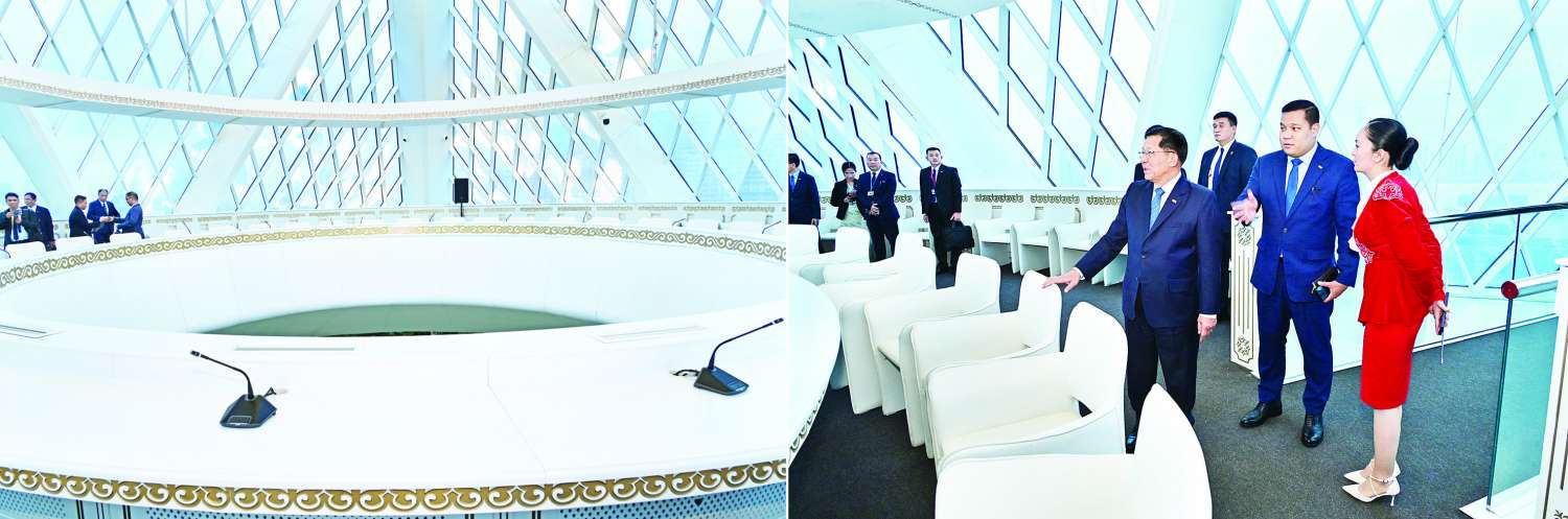 ယင်းနောက် နိုင်ငံတော်ယာယီသမ္မတ နိုင်ငံတော်လုံခြုံရေးနှင့် အေးချမ်းသာယာရေးကော်မရှင်ဥက္ကဋ္ဌနှင့် အဖွဲ့ဝင်များအား အမျိုးသားပြန်လည်သင့်မြတ်ရေးနှင့် ငြိမ်းချမ်းရေးနန်းတော်မှ General Director Mr. Yakupov Daniyar Abaevich နှင့် တာ၀န်ရှိသူများက ဧည့်ခန်းမဆောင်တွင် တွေ့ဆုံ၍ ကာဇက်စတန်နိုင်ငံ၏ သမိုင်းကြောင်းဆိုင်ရာနှင့် အမျိုးသားပြန်လည်သင့်မြတ်ရေးနှင့် ငြိမ်းချမ်းရေးနန်းတော်ဆိုင်ရာများ၊ ကာဇက်စတန်နိုင်ငံတွင် လူမျိုးပေါင်း ၃၀၀ ကျော်ရှိပြီး လူမျိုးစု များအကြားငြိမ်းချမ်းစွာ အတူယှဉ်တွဲနေထိုင်ရန်လိုအပ်သည့်အတွက် အမျိုးသားပြန်လည်သင့်မြတ်ရေးနှင့် ငြိမ်းချမ်းရေးနန်းတော်ကို တည်ဆောက်ခဲ့မှုနှင့် အမျိုးသားရေးညီလာခံကို နှစ်စဉ်လက်ခံကျင်းပဆောင်ရွက်လျက်ရှိမှု၊ လူမျိုးစုများအချင်းချင်း ချစ်ကြည်မှုနှင့် နားလည်မှုရှိအောင်ဆောင်ရွက်သွားရန်လိုအပ်မှု၊ ကာဇက်စတန်နိုင်ငံ ရှိဘာသာရေးဆိုင်ရာ ခေါင်းဆောင်များအစည်းအဝေးကိုလည်း လက်ခံကျင်းပခဲ့မှုနှင့် နန်းတော်အတွင်း ငြိမ်းချမ်းရေးနှင့် ဘာသာရေးဆိုင်ရာအခမ်းအနားများ ကျင်းပပြုလုပ်ခဲ့မှုတို့နှင့်ပတ်သက်၍ ရှင်းလင်းတင်ပြသည်။