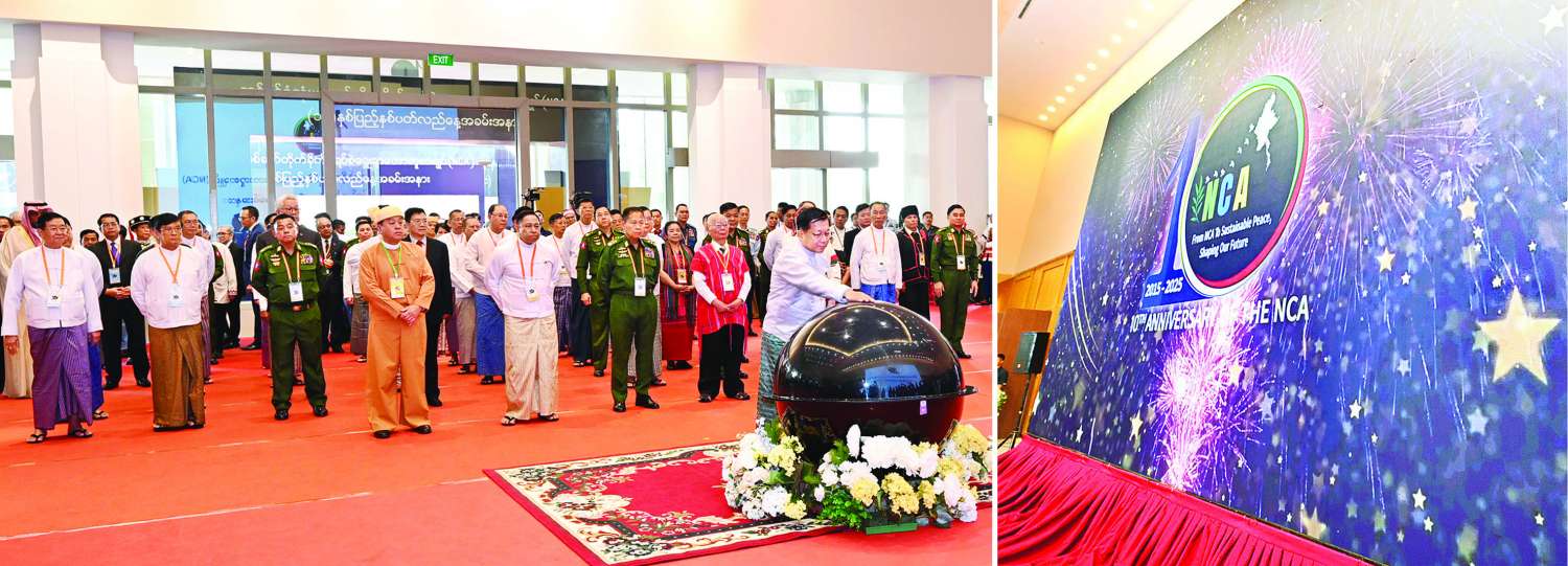 ထို့နောက် နိုင်ငံတော်ယာယီသမ္မတ နိုင်ငံတော်လုံခြုံရေးနှင့်အေးချမ်းသာယာရေးကော်မရှင် ဥက္ကဋ္ဌ အမျိုးသားစည်းလုံးညီညွတ်ရေးနှင့် ငြိမ်းချမ်းရေးဖော်ဆောင်မှု ဗဟိုကော်မတီ ဥက္ကဋ္ဌ ဗိုလ်ချုပ်မှူးကြီး မင်းအောင်လှိုင် က တစ်နိုင်ငံလုံး ပစ်ခတ်တိုက်ခိုက်မှုရပ်စဲရေး သဘောတူစာချုပ်(NCA) (၁၀)နှစ်ပြည့်နှစ်ပတ်လည်နေ့ အခမ်းအနားဆိုင်းဘုတ်ကို စက်ခလုတ်နှိပ်၍ ဖွင့်လှစ်ပေးသည်။