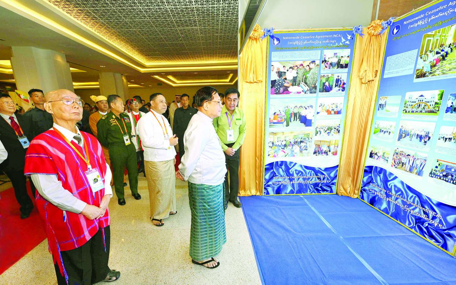 ယင်းနောက် နိုင်ငံတော်ယာယီသမ္မတ နိုင်ငံတော်လုံခြုံရေးနှင့် အေးချမ်းသာယာရေးကော်မရှင်ဥက္ကဋ္ဌ အမျိုးသားစည်းလုံးညီညွတ်ရေးနှင့် ငြိမ်းချမ်းရေးဖော်ဆောင်မှု ဗဟိုကော်မတီ ဥက္ကဋ္ဌနှင့် အခမ်းအနားသို့ တက်ရောက်လာကြသည့် ဧည့်သည်တော်များသည် (MICC-1) Lobby ၌ ခင်းကျင်းပြသထားသည့် တစ်နိုင်ငံလုံး ပစ်ခတ်တိုက်ခိုက်မှုရပ်စဲရေး သဘောတူစာချုပ် (NCA) (၁၀) နှစ်ပြည့်နှစ်ပတ်လည်နေ့ အထိမ်းအမှတ်ပြခန်းများကို စိတ်ပါဝင်စားစွာဖြင့် လှည့်လည်ကြည့်ရှုကြသည်။