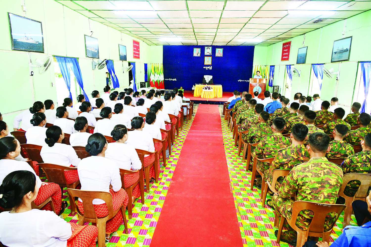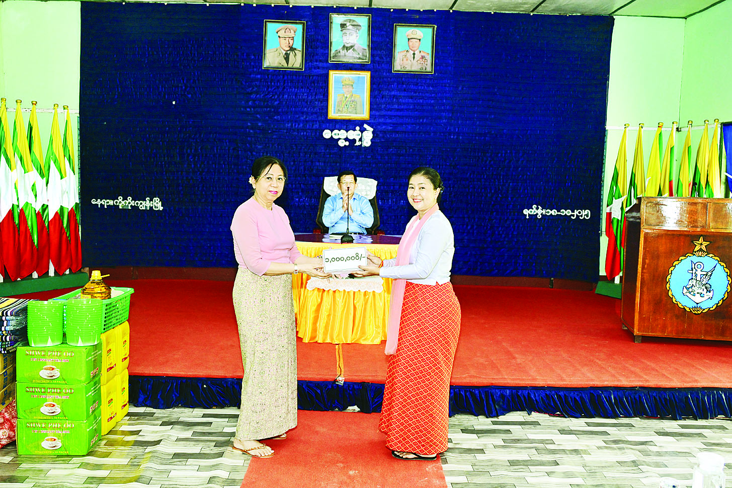 ထို့နောက် နိုင်ငံတော်လုံခြုံရေးနှင့်အေးချမ်းသာယာရေးကော်မရှင်ဥက္ကဋ္ဌ တပ်မတော်ကာကွယ်ရေးဦးစီးချုပ်က တပ်နယ်မှအရာရှိ၊ စစ်သည်မိသားစုများအတွက် စားသောက်ဖွယ်ရာများကိုလည်းကောင်း၊ နိုင်ငံတော်လုံခြုံရေးနှင့်အေးချမ်းသာယာရေးကော်မရှင်ဥက္ကဋ္ဌ တပ်မတော်ကာကွယ်ရေးစီးချုပ်၏ ဇနီးက တပ်နယ်မိခင်နှင့် ကလေးရန်ပုံငွေများကိုလည်းကောင်း ပေးအပ်ရာ ရေတပ်ဌာနချုပ်မှူးနှင့် ဇနီးတို့က လက်ခံရယူကြသည်။