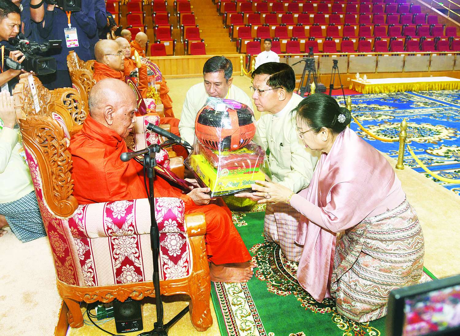 ၎င်းနောက် နိုင်ငံတော်ယာယီသမ္မတ နိုင်ငံတော်လုံခြုံရေးနှင့်အေးချမ်းသာယာရေးကော်မရှင်ဥက္ကဋ္ဌနှင့် ဇနီး၊ ဧည့်ပရိသတ်များသည် နေပြည်တော်တိုင်းသံဃနာယကအဖွဲ့ဝင်၊ တပ်ကုန်းမြို့၊ ငွေတောင်တောရကျောင်းတိုက် တိုက်အုပ်ဆရာတော် ဂန္ထဝါစကပဏ္ဍိတ ဘဒ္ဒန္တကောဏ္ဍညနှင့် နိုင်ငံတော်ဗဟိုသံဃဝန်ဆောင် ပျဉ်းမနားမြို့၊ အုန်းတောကျောင်းတိုက်ဆရာတော် မဟာဂန္ထဝါစကပဏ္ဍိတ ဘဒ္ဒန္တတိဿတို့ထံမှ ကထိန်အမေးအဖြေများကို နာယူကြည်ညိုကြသည်။