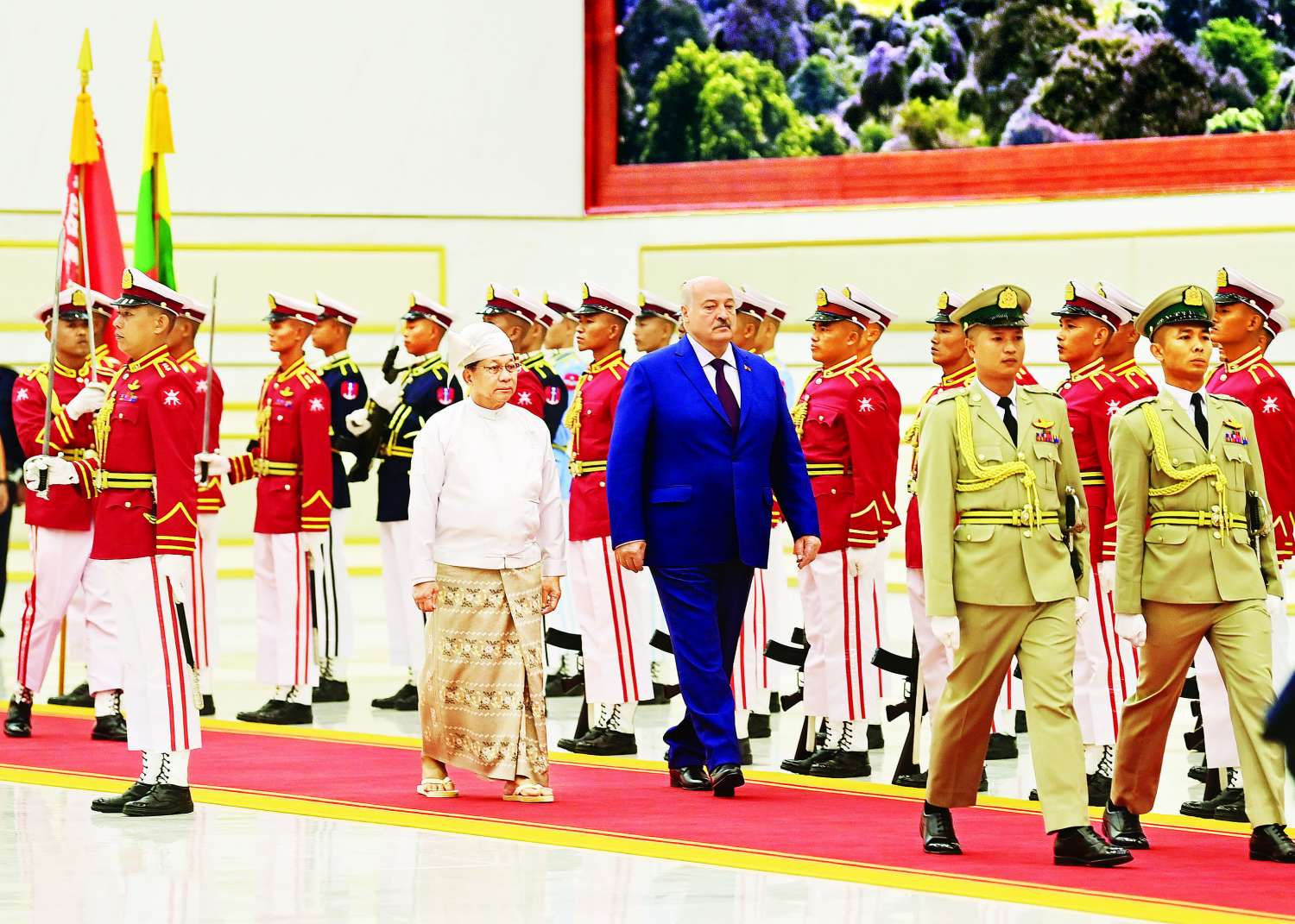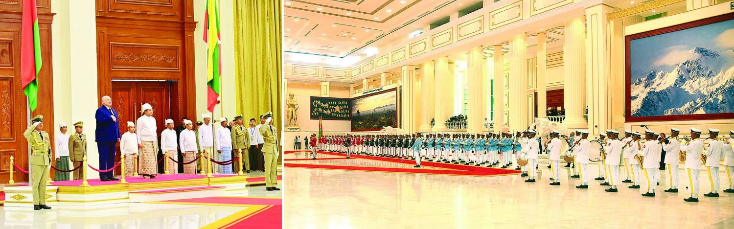 ပြည်ထောင်စုသမ္မတမြန်မာနိုင်ငံတော်ယာယီသမ္မတ နိုင်ငံတော်လုံခြုံရေးနှင့်အေးချမ်းသာယာရေးကော်မရှင်ဥက္ကဋ္ဌ ဗိုလ်ချုပ်မှူးကြီး မင်းအောင်လှိုင်သည် မြန်မာနိုင်ငံသို့ တရားဝင်ချစ်ကြည်ရေးခရီး ရောက်ရှိလာသော ဘယ်လာရုစ်သမ္မတနိုင်ငံသမ္မတ H.E. Mr. Aleksandr Lukashenko အား ယနေ့နံနက်ပိုင်းတွင် သမ္မတအိမ်တော် ဆင်ဖြူတော်ဆောင်ဧည့်ခန်းမ၌ ဂုဏ်ပြုတပ်ဖွဲ့ဖြင့် ကြိုဆိုသည်။