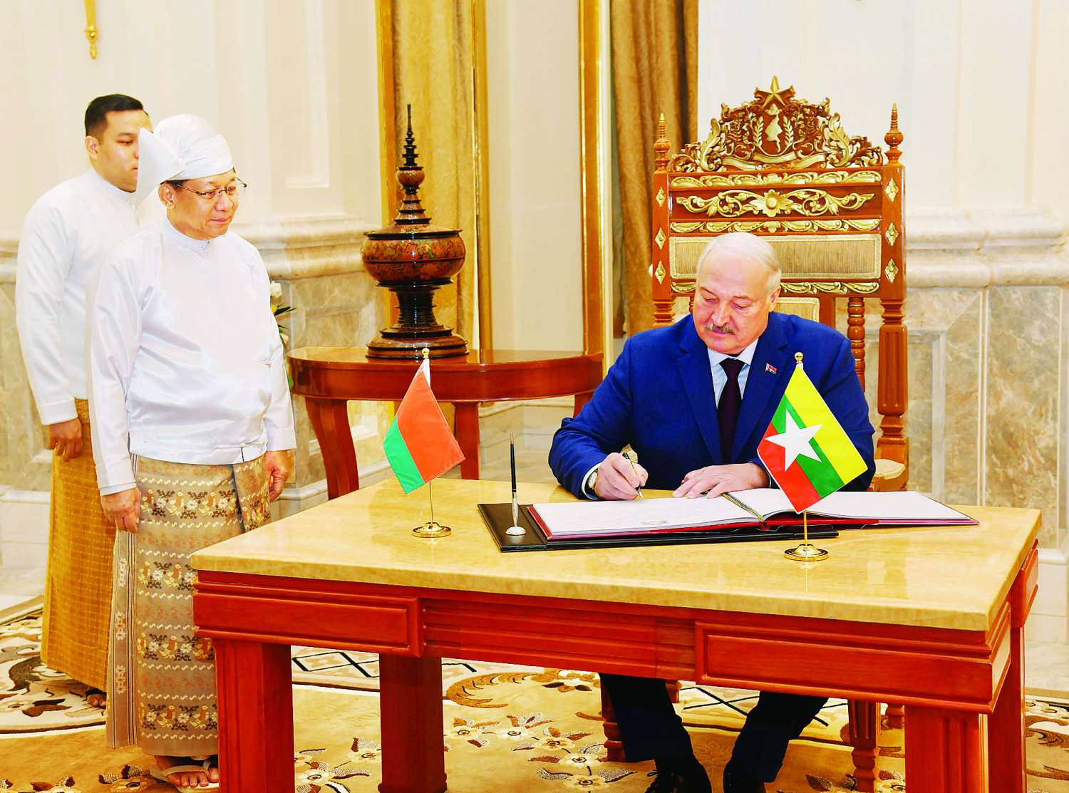 ၎င်းနောက် ဘယ်လာရုစ်သမ္မတနိုင်ငံသမ္မတသည် ပြည်ထောင်စုသမ္မတမြန်မာနိုင်ငံတော်၊ နိုင်ငံတော်သမ္မတအိမ်တော် ဧည့်သည်တော်မှတ်တမ်းစာအုပ်တွင် အမှတ်တရလက်မှတ်ရေးထိုးပြီး နိုင်ငံတော်ယာယီသမ္မတ နိုင်ငံတော်လုံခြုံရေးနှင့်အေးချမ်းသာယာရေးကော်မရှင်ဥက္ကဋ္ဌနှင့်အတူ မှတ်တမ်းတင်ဓာတ်ပုံရိုက်သည်။