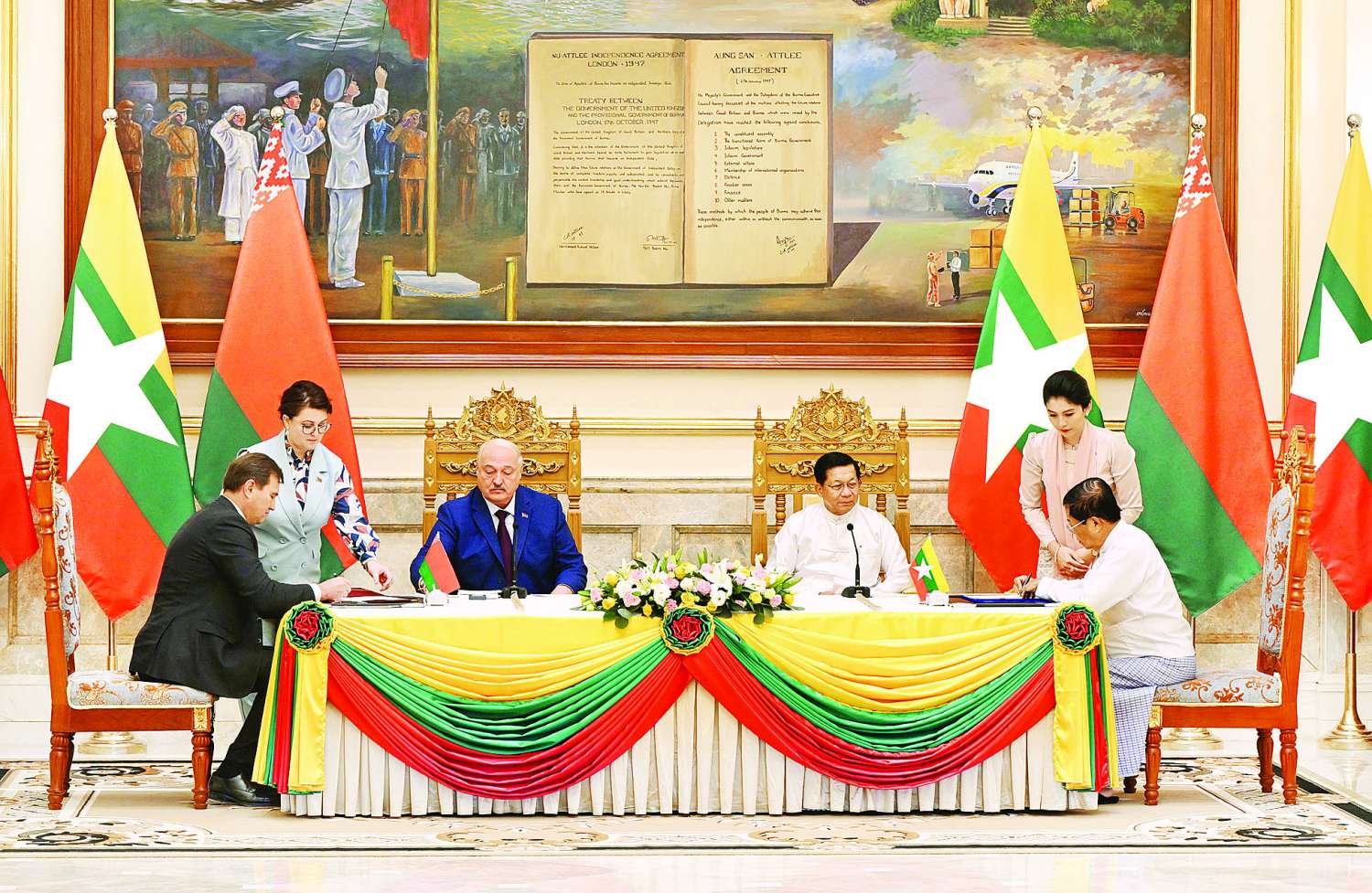ထို့နောက် ဘယ်လာရုစ်သမ္မတနိုင်ငံသမ္မတက ပြန်လည်ဆွေးနွေးပြောကြားရာတွင် မိမိနှင့်ချစ်ကြည်ရေးကိုယ်စားလှယ်အဖွဲ့ဝင်များအား နွေးထွေးစွာဖြင့် ကြိုဆို သည့်အတွက်လှိုက်လှိုက်လှဲလှဲကျေးဇူးတင်ရှိပါကြောင်း၊ မိမိအနေဖြင့် မြန်မာနိုင်ငံသို့ ပထမဆုံးလာရောက်သည့် ခရီးစဉ်ဖြစ်သည့်အတွက် ဝမ်းမြောက်ဂုဏ်ယူမိသည်ကို ပြောကြားလိုကြောင်း၊ အဆွေတော်အနေဖြင့် မတ်လအတွင်း ဘယ်လာရုစ်နိုင်ငံသို့ တရားဝင်ချစ်ကြည်ရေးခရီးစဉ်လာရောက်ခဲ့မှုသည်လည်း မြန်မာနိုင်ငံမှ နိုင်ငံတော်အကြီးအကဲတစ်ဦး၏ ပထမဆုံးချစ်ကြည်ရေးခရီးစဉ်ဖြစ်ပါကြောင်း၊ ယခုနှစ်အတွင်း မိမိတို့နှစ်ဦးအနေဖြင့် ၆ ကြိမ်တွေ့ဆုံခဲ့ပြီးဖြစ်ကြောင်း၊ ထို့ကြောင့် ၂၀၂၅ ခုနှစ်သည် နှစ်နိုင်ငံအတွက် အမှတ်တရများ များစွာရှိပြီး နှစ်နိုင်ငံအကြား သမိုင်းအသစ်များ စိုက်ထူနိုင်သည့် နှစ်တစ်နှစ်ဖြစ်ပါကြောင်း၊ နှစ်နိုင်ငံအကြား ပူးပေါင်းဆောင်ရွက်မှုများကို အောင်အောင်မြင်မြင် လုပ်ဆောင်လျက်ရှိကြောင်း၊ မင့်စ်မြို့တွင် ကျင်းပခဲ့သည့် EAEU အစည်းအဝေးသို့ မြန်မာနိုင်ငံမှ နိုင်ငံခြားရေးဝန်ကြီးဦးဆောင်၍ တက်ရောက်ခဲ့ကြောင်း၊ ယခုနှစ်အတွင်း မိမိတို့အနေဖြင့် နိုင်ငံတကာအခမ်းအနားများ၊ နိုင်ငံတကာအစည်းအဝေးများတွင် တွေ့ဆုံဆွေးနွေးမှုများ များစွာပြုလုပ်နိုင်ခဲ့ကြောင်း၊ ထိုသို့တွေ့ဆုံချိန်တွင် အပြန်အလှန်ကူညီရေးဆိုင်ရာများကို ဆွေးနွေးနိုင်ခဲ့ကြောင်း၊ မိမိတို့နိုင်ငံအနေဖြင့် မြန်မာနိုင်ငံနှင့်ပတ်သက်ပြီး အမြဲတံခါးဖွင့်ထားပါကြောင်း၊ မြန်မာနိုင်ငံနှင့် ပူးပေါင်းဆောင်ရွက်မှုများ ဆောင်ရွက်ချိန်တွင် မည်သည့်ပြင်ပနှောင့်ယှက်စွက်ဖက်မှုများရှိနေပါစေ တစ်စိုက်မတ်မတ်ဖြင့် ဆက်လက်ပူးပေါင်းဆောင်ရွက်သွားမည်ကို ပြောကြားလိုပါကြောင်း၊ မိမိတို့နိုင်ငံမှ တာဝန်ရှိသည့်ဝန်ကြီးများ၊ မြန်မာနိုင်ငံမှ တာဝန်ရှိသည့် ဝန်ကြီးများ ပူးပေါင်း၍ စီးပွားရေးဖိုရမ်များကျင်းပခဲ့ပြီး တွေ့ဆုံဆွေးနွေးမှုများ ပြုလုပ်ခဲ့ပါကြောင်း၊ ထိုမှတစ်ဆင့် နှစ်နိုင်ငံပူးပေါင်းဆောင်ရွက်မှုများ အောင်မြင်စေရေးနှင့် ရလဒ်ကောင်းများ ရရှိစေရေးဆွေးနွေးဆောင်ရွက်နိုင်ခဲ့ပါကြောင်း၊ မိမိတို့အနေဖြင့် ယနေ့တွင် နှစ်နိုင်ငံပူးပေါင်းဆောင်ရွက်မှုမြှင့်တင်ရေးဆိုင်ရာ လမ်းပြမြေပုံ (၂၀၂၆-၂၀၂၈) ကိုလက်မှတ်ရေးထိုးသွားမည်ဖြစ်ပါကြောင်း၊ အဆိုပါလမ်းပြမြေပုံ၌ နှစ်နိုင်ငံပူးပေါင်းဆောင်ရွက်ရေးနှင့်ပတ်သက်သည့် အချက်များစွာ ပါဝင်ကြောင်း၊ အဆိုပါလမ်းပြမြေပုံအတိုင်း ဆောင်ရွက်သွားမည်ဆိုပါက နှစ်နိုင်ငံ စီးပွားရေးဆိုင်ရာ ပူးပေါင်းဆောင်ရွက်မှုများ ပိုမိုအောင်မြင်နိုင်မည်ဖြ