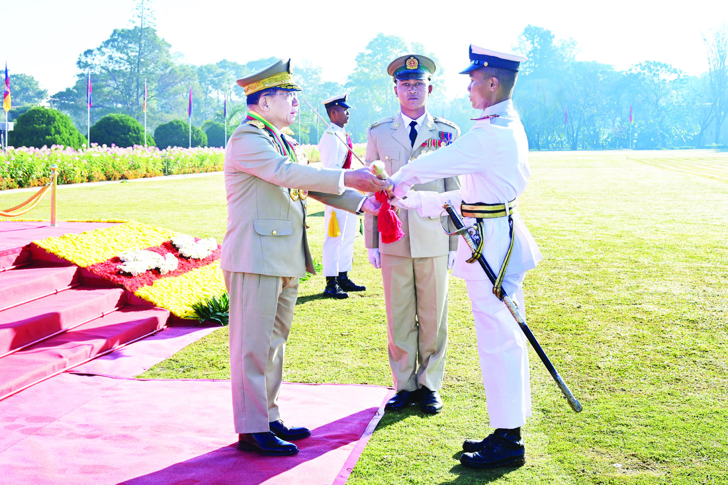 ယင်းနောက် နိုင်ငံတော်လုံခြုံရေးနှင့် အေးချမ်းသာယာရေးကော်မရှင်ဥက္ကဋ္ဌ တပ်မတော်ကာကွယ်ရေးဦးစီးချုပ် ဗိုလ်ချုပ်မှူးကြီး သတိုးမဟာသရေစည်သူ သတိုးသီရိသုဓမ္မ မင်းအောင်လှိုင်သည် ဗိုလ်လောင်းတပ်ခွဲများ၏ အလေးပြုခြင်းကို ခံယူပြီးနောက် စစ်ရေးပြအခမ်းအနားမှ ပြန်လည်ထွက်ခွာသည်။