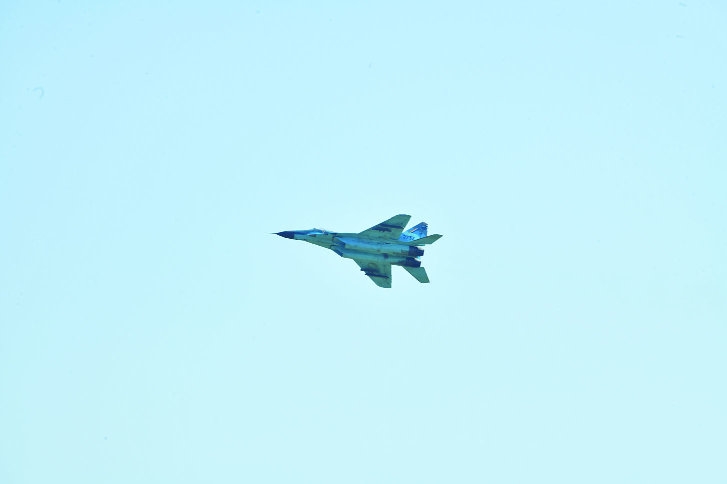 ထိုသို့ စွမ်းရည်ပြသရာတွင် MiG-29 ဘက်စုံသုံးဂျက်တိုက်လေယာဉ်တစ်စီးက ရှုရပ်၏ ရှေ့တည့်တည့်မှ ဝင်ရောက်လာပြီး Victory Roll Maneuver နှင့် Level 8 Maneuver ကိုလည်းကောင်း၊ Combat Turn နှင့် Multiple Roll Maneuver ကိုလည်းကောင်း၊ Slow Flight နှင့် Zoom Climb Maneuver ၊ Vertical Roll Maneuver တို့ကိုလည်းကောင်း စွမ်းရည်ပြပျံသန်းပြီး MiG-29 ဘက်စုံသုံး ဂျက်တိုက်လေယာဉ် ၄ စီးက ရှုရပ်၏ ရှေ့တည့်တည့်မှ Box Formation ပုံစံဖြင့် အုပ်ဖွဲ့ပျံသန်းအလေးပြုကြသည်။