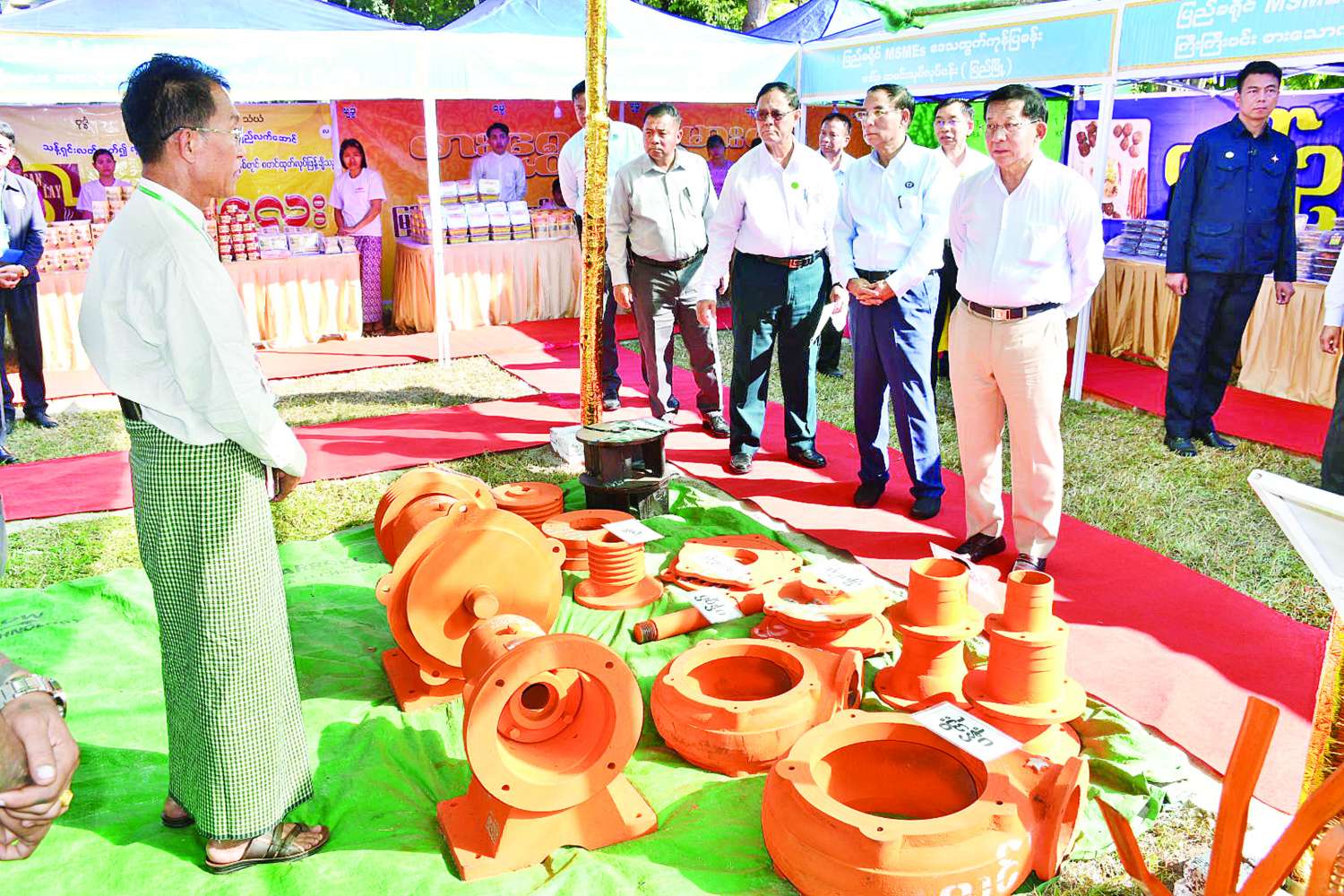 ထို့နောက် နိုင်ငံတော်ယာယီသမ္မတ နိုင်ငံတော်လုံခြုံရေးနှင့်အေးချမ်းသာယာရေးကော်မရှင်ဥက္ကဋ္ဌသည် ခင်းကျင်းပြသထားသည့် ပြည်ခရိုင်အတွင်းရှိ အသေးစား၊ အငယ်စားနှင့် အလတ်စားစီးပွားရေး (MSME) လုပ်ငန်းများမှထွက်ရှိသည့် ထုတ်ကုန်ပစ္စည်းများ၊ လယ်ယာသုံးထုတ်ကုန်ပစ္စည်းများအား လှည့်လည်ကြည့်ရှုပြီး တာဝန်ရှိသူများ၏ တင်ပြချက်များအပေါ်လိုအပ်သည်များ လမ်းညွှန်မှာကြားခဲ့သည်။