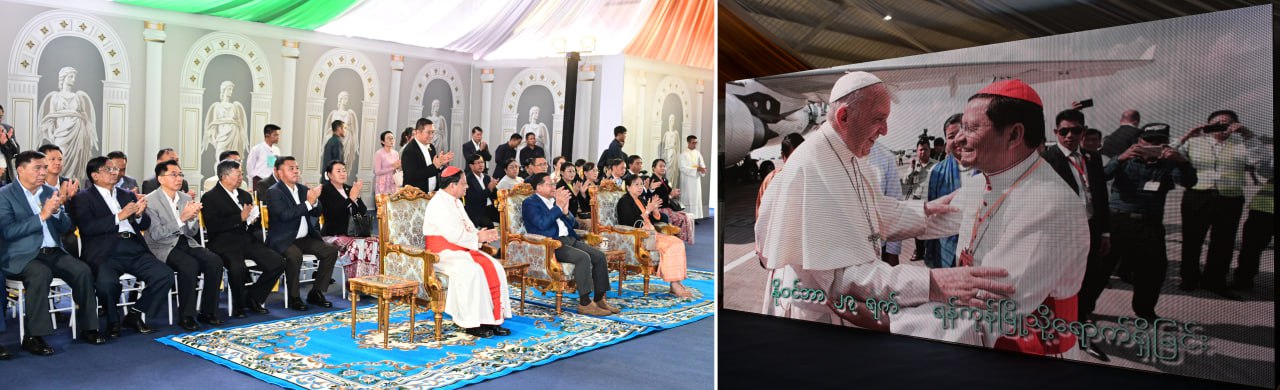 ဦးစွာ နိုင်ငံတော်ယာယီသမ္မတ နိုင်ငံတော်လုံခြုံရေးနှင့်အေးချမ်းသာယာရေးကော်မရှင်ဥက္ကဋ္ဌနှင့်ဇနီး၊ အဖွဲ့ဝင်များသည် စိန့်မေရီကာသီဒြယ်ကက်သလစ်ဘုရား ကျောင်းတော်ကြီးသို့ ရောက်ရှိကြရာ ကက်သလစ်ဂိုဏ်းချုပ်သာသနာ၊ ဂိုဏ်းချုပ်ဆရာတော်ကြီး ကာဒီနယ်ချားလ်စ်ဘိုက ကြိုဆိုနှုတ်ဆက်ပြီး ခရစ်ယာန်လူငယ်လေးများက ခရစ်ယာန်ဓမ္မတေးသီချင်းများဖြင့် သီဆိုတီးမှုတ်ကပြဖျော်ဖြေပြီး ကြိုဆိုနှုတ်ဆက်ကြသည်။