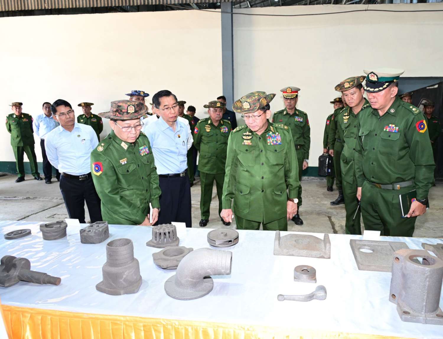 ယင်းနောက် နိုင်ငံတော်လုံခြုံရေးနှင့် အေးချမ်းသာယာရေးကော်မရှင်ဥက္ကဋ္ဌ တပ်မတော်ကာကွယ်ရေးဦးစီးချုပ်နှင့် အဖွဲ့ဝင်များသည် စက်ရုံအတွင်းအလုပ်ရုံများအား လှည့်လည်၍ လက်ဆွဲကောက်စိုက်စက်၊ Manual Drum Seeder များနှင့် ဆက်စပ်ပစ္စည်းများ ထုတ်လုပ်နေမှု၊ သံရည်ကြိုအလုပ်ရုံအတွင်း စက်ပစ္စည်းအစိတ်အပိုင်းများ သွန်းလောင်းထုတ်လုပ်နေမှု၊ သံဂဟေချောင်းအလုပ်ရုံအတွင်း သံဂဟေချောင်းများ အဆင့်ဆင့်ထုတ်လုပ်နေမှုတို့ကို ကြည့်ရှုစစ်ဆေးခဲ့ပြီး တာဝန်ရှိသူများ၏တင်ပြချက်များအပေါ် လိုအပ်သည်များ လမ်းညွှန်မှာကြားသည်။
