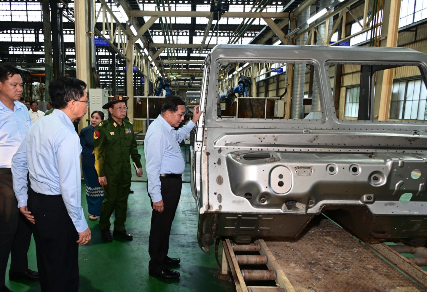 ယင်းနောက် နိုင်ငံတော်လုံခြုံရေးနှင့် အေးချမ်းသာယာရေးကော်မရှင်ဥက္ကဋ္ဌ တပ်မတော်ကာကွယ်ရေးဦးစီးချုပ်နှင့် အဖွဲ့ဝင်များသည် စက်ရုံအတွင်းရှိ အလုပ်ရုံများအတွင်း မော်တော်ယာဉ်များထုတ်လုပ်နေမှု လုပ်ငန်းစဉ်အဆင့်ဆင့်၊ ထုတ်လုပ်ပြီး မော်တော်ယာဉ်များအား စစ်ဆေးစမ်းသပ်နေမှုနှင့် ထုတ်လုပ်ထားရှိသည့် မော်တော်ယာဉ်များအား လိုက်လံကြည့်ရှုစစ်ဆေးခဲ့ပြီး တာဝန်ရှိသူများ၏ တင်ပြချက်များအပေါ် လိုအပ်သည်များ လမ်းညွှန်မှာကြား ဖြည့်ဆည်းဆောင်ရွက်ပေးခဲ့သည်။