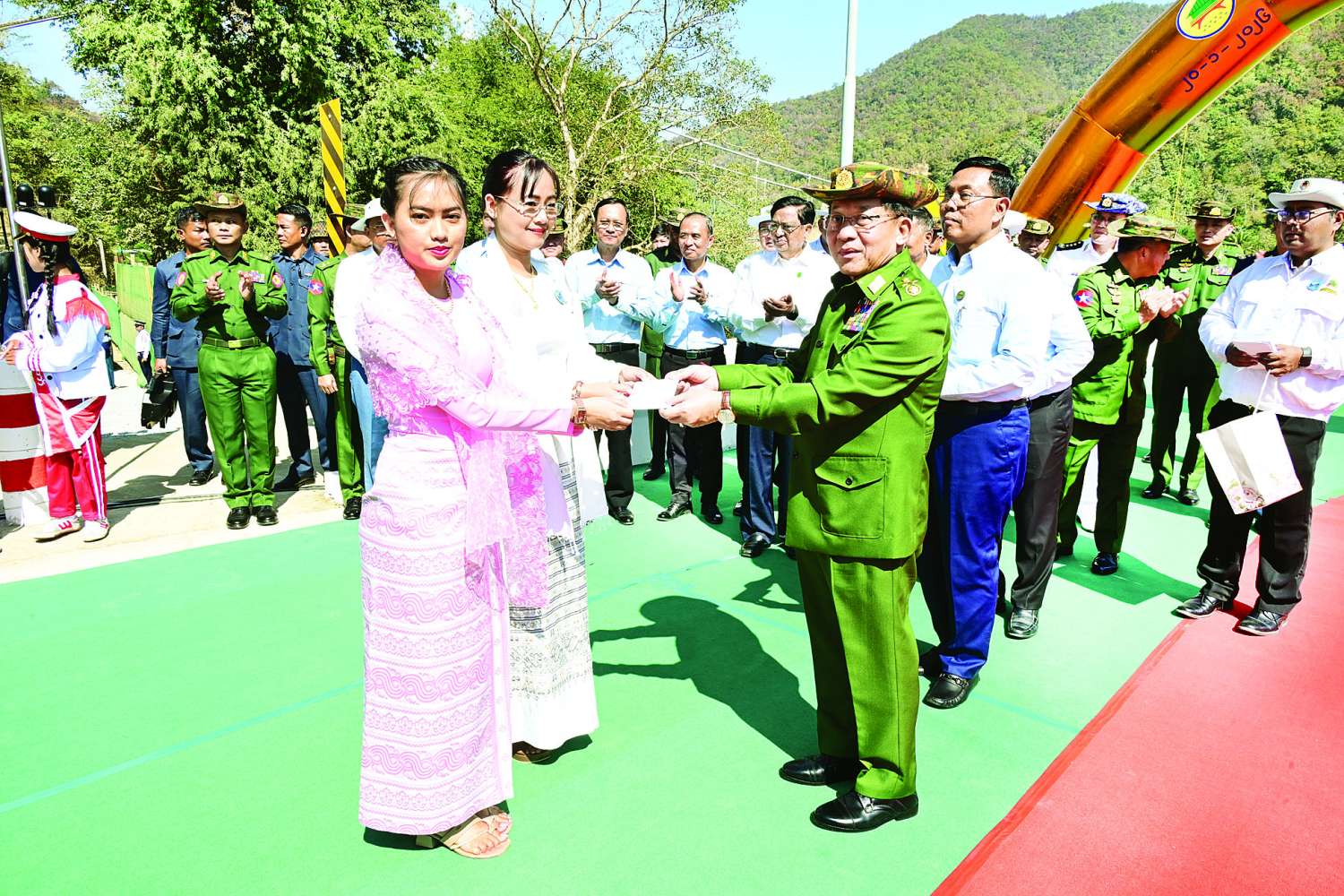 ထို့နောက် နိုင်ငံတော်ယာယီသမ္မတ နိုင်ငံတော်လုံခြုံရေးနှင့် အေးချမ်းသာယာရေးကော်မရှင်ဥက္ကဋ္ဌထံသို့ ဆောက်လုပ်ရေးဝန်ကြီးဌာန၊ ပြည်ထောင်စုဝန်ကြီးက သံလွင်တံတား (တာဆန်း) ဖွင့်ပွဲအထိမ်းအမှတ်လက်ဆောင်ကို ဂါရဝပြုပေးအပ်သည်။ ယင်းနောက် နိုင်ငံတော်ယာယီသမ္မတ နိုင်ငံတော်လုံခြုံရေးနှင့် အေးချမ်းသာယာရေးကော်မရှင်ဥက္ကဋ္ဌက ကျောင်းသား၊ ကျောင်းသူများနှင့် ဒေသခံပြည်သူများအား ဂုဏ်ပြုချီးမြှင့်ငွေများ ပေးအပ်သည်။