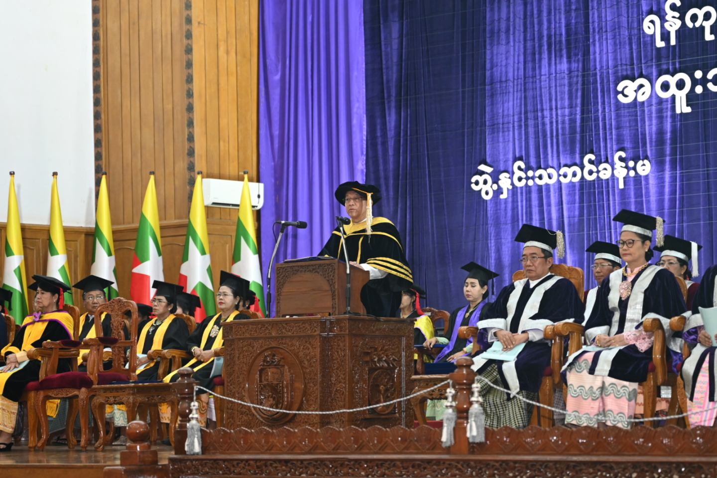 ၎င်းနောက် ရန်ကုန်တက္ကသိုလ်ပါမောက္ခချုပ်က ဘွဲ့နှင်းသဘင်မိန့်ခွန်းပြောကြားပြီး ဘွဲ့နှင်းသဘင်မိန့်ခွန်းကို မော်ကွန်းတိုက်တွင် ထိန်းသိမ်းရန် ရန်ကုန်တက္ကသိုလ်မော်ကွန်းထိန်းက ကြေညာသည်။
