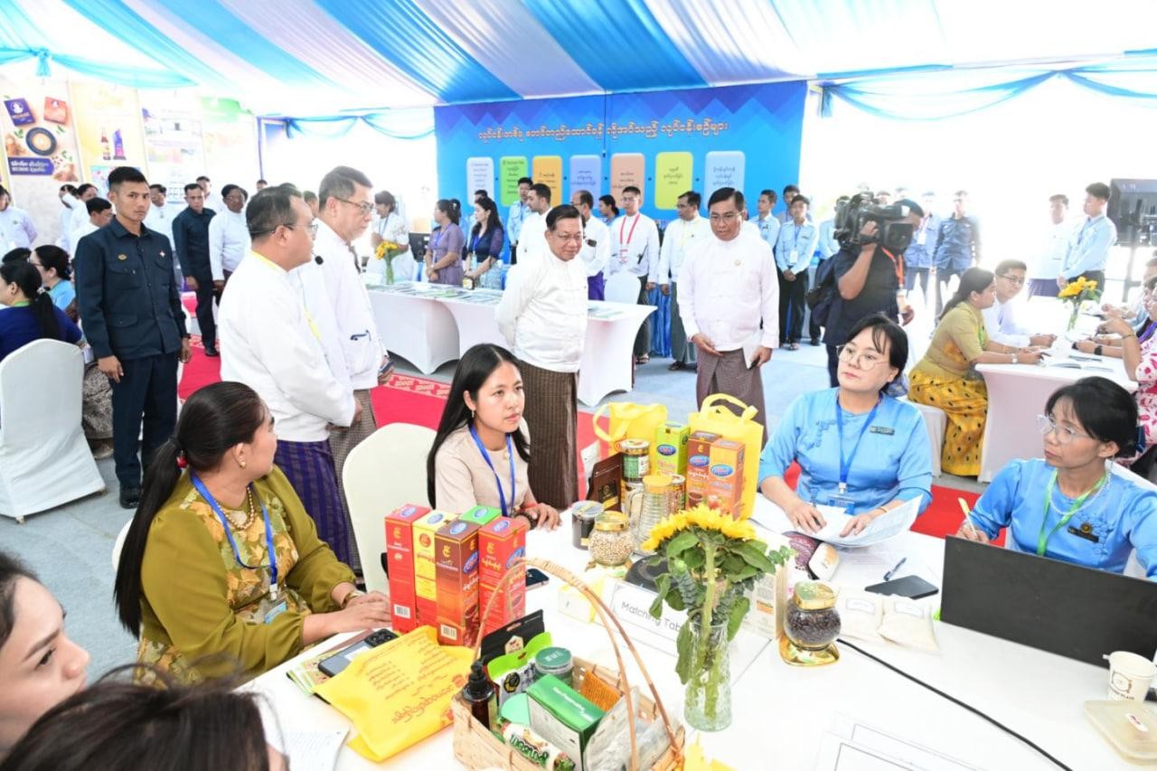 ထိုသို့လှည့်လည်ကြည့်ရှုရာတွင် နိုင်ငံတော်ယာယီသမ္မတ နိုင်ငံတော်လုံခြုံရေးနှင့်အေးချမ်းသာယာရေးကော်မရှင်ဥက္ကဋ္ဌနှင့် အဖွဲ့ဝင်များသည် ၂၀၂၆ ခုနှစ်၊ (၇၉) နှစ်မြောက် ပြည်ထောင်စုနေ့အထိမ်းအမှတ် ပြည်ထောင်စုအဆင့် MSME ထုတ်ကုန်ပြပွဲနှင့် ဈေးရောင်းပွဲတော်၌ ပါဝင်ခင်းကျင်းပြသထားသည့် စီးပွားရေးနှင့်ကူးသန်းရောင်းဝယ်ရေးဝန်ကြီးဌာန ပြည်ပဈေးကွက်ချိတ်ဆက်ရေးလုပ်ငန်းအဖွဲ့ပြခန်း၊ ပြည်တွင်းဈေးကွက်ချိတ်ဆက်ရေးလုပ်ငန်းအဖွဲ့ပြခန်း၊ ဝန်ကြီးဌာနများနှင့် ချိတ်ဆက်ရေးလုပ်ငန်းအဖွဲ့ပြခန်းများအတွင်း MSME ကုန်ထုတ်လုပ်ငန်းများဆောင်ရွက်လျက်ရှိသည့် လုပ်ငန်းရှင်များ၏ ပြည်တွင်းပြည်ပဈေးကွက်ရရှိရေး တွေ့ဆုံဆွေးနွေးချိတ်ဆက်ဆောင်ရွက်နေမှုများကို လှည့်လည်ကြည့်ရှုအားပေးကြသည်။