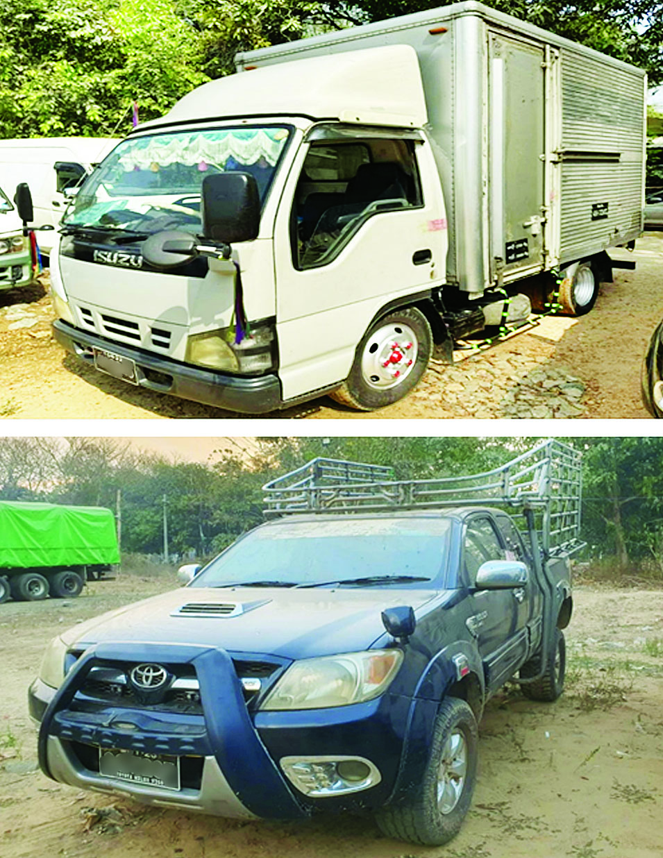 တရားမဝင်သစ်မျိုးစုံ၊ စက်သုံးဆီများ၊ စားသောက်ကုန်ပစ္စည်းများ၊ လူသုံးကုန်ပစ္စည်းများ၊ လုပ်ငန်းသုံးပစ္စည်းများ၊ လိုင်စင်မဲ့မော်တော်ဆိုင်ကယ်နှင့် တရားမဝင်ကုန်ပစ္စည်းတင် မော်တော်ယာဉ်များ ဖမ်းဆီးရမိ