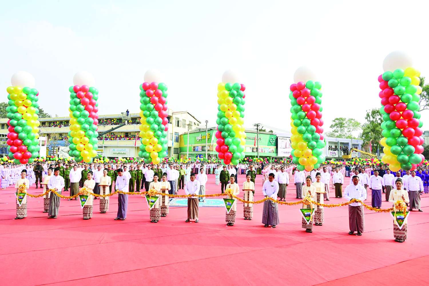 ဦးစွာ နိုင်ငံတော်ယာယီသမ္မတ နိုင်ငံတော်လုံခြုံရေးနှင့်အေးချမ်းသာယာရေးကော်မရှင်ဥက္ကဋ္ဌသည် ပြင်ဦးလွင်မြို့၊ သုမင်္ဂလာအဆင့်မြင့်ဈေးသို့ရောက်ရှိကြရာ တိုင်းရင်းသားယဉ်ကျေးမှုအဖွဲ့များနှင့် တာဝန်ရှိသူများက ကြိုဆိုနှုတ်ဆက်ကြပြီး အမျိုးသားယဉ်ကျေးမှုနှင့် အနုပညာတက္ကသိုလ် (မန္တလေး)နှင့် ပညာရေးဒီဂရီကောလိပ် (မန္တလေး)တို့မှ ကျောင်းသူလေးများက “ပန်းကမ္ဘာမျှော်စင်” တေးသီချင်းဖြင့် ကပြဖျော်ဖြေကြိုဆိုကြသည်။