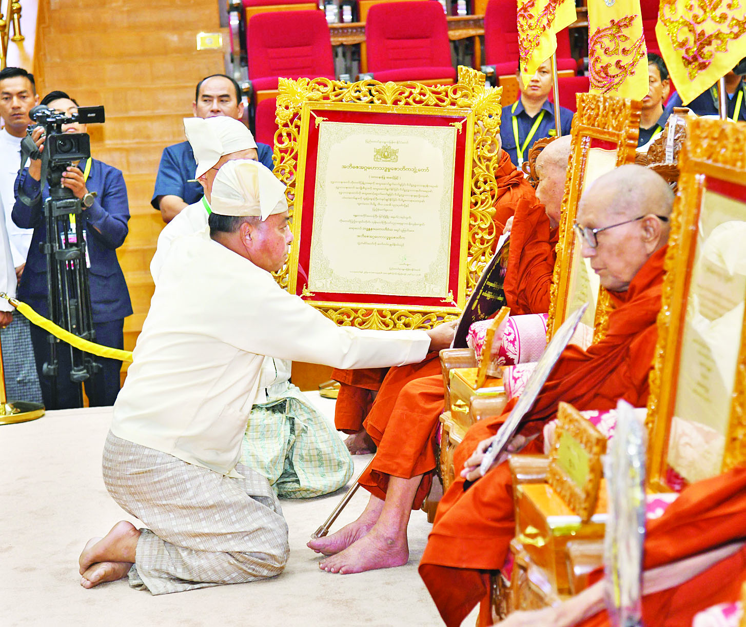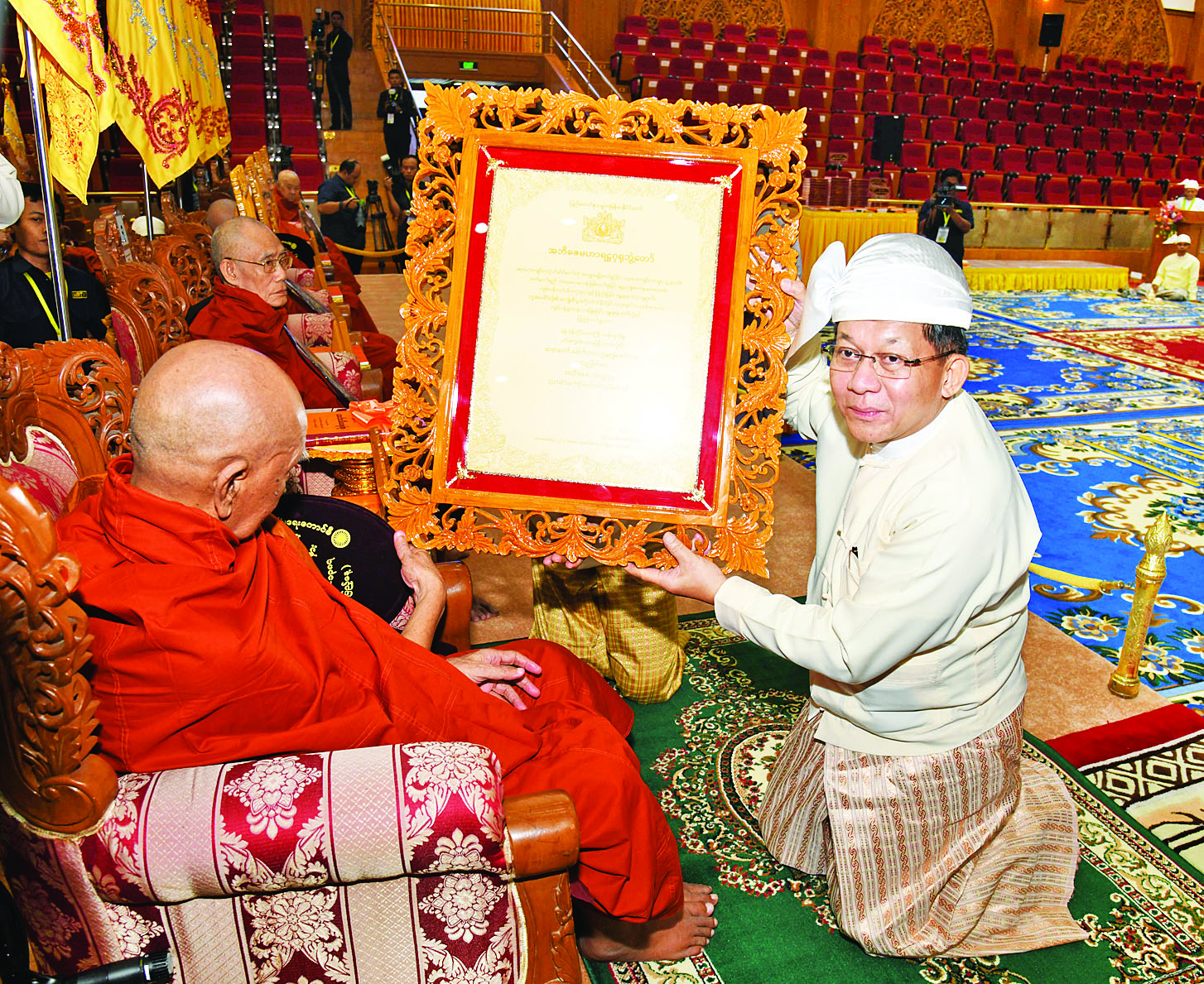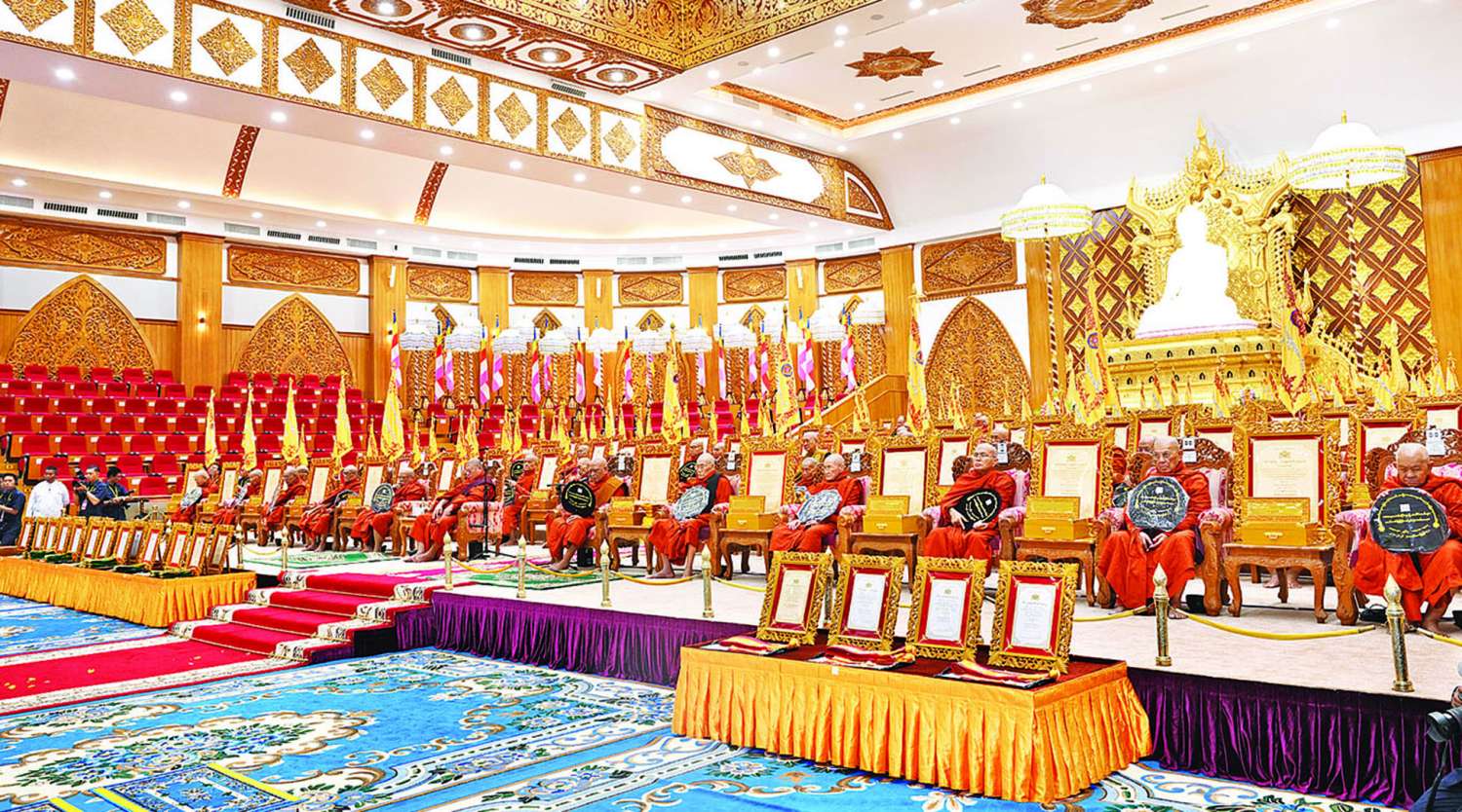 အခမ်းအနားသို့ နိုင်ငံတော်သံဃမဟာနာယကအဖွဲ့ဥက္ကဋ္ဌ အဘိဓဇမဟာရဋ္ဌဂုရု အဂ္ဂမဟာသဒ္ဒမ္မဇောတိကဓဇ သန်လျင်မင်းကျောင်း ဆရာတော် ဒေါက်တာဘဒ္ဒန္တ စန္ဒိမာဘိဝံသနှင့် နိုင်ငံတော်သံဃမဟာနာယကအဖွဲ့ အကျိုးတော်ဆောင်၊ မန္တလေးမြို့၊ မစိုးရိမ်တိုက်သစ်မဟာနာယက၊ ဓမ္မသမိဒ္ဓိကျောင်း ဆရာတော်အဂ္ဂမဟာပဏ္ဍိတ အဂ္ဂမဟာသဒ္ဓမ္မဇောတိကဓဇ မဟာဓမ္မကထိက ဗဟုဇနဟိတဓရ ဘဒ္ဒန္တဝါသေဋ္ဌာ ဘိဝံသတို့အမှူးပြုသည့် ၂၀၂၆ ခုနှစ်၊ သာသနာတော်ဆိုင်ရာဘွဲ့တံဆိပ်တော်များ ဆက်ကပ်ကော်ရော် အပူဇော်ခံတော်မူကြမည့် ပြည်တွင်း၊ ပြည်ပဆရာတော်၊ သံဃာတော်များနှင့် သီလရှင်ဆရာကြီးများ ကြွရောက်ချီးမြှင့်တော်မူကြပြီး နိုင်ငံတော်ယာယီ သမ္မတ နိုင်ငံတော်လုံခြုံရေးနှင့် အေးချမ်းသာယာရေးကော်မရှင်ဥက္ကဋ္ဌနှင့် ဇနီးတို့နှင့်အတူ ကော်မရှင်ဒုတိယဥက္ကဋ္ဌ ဒုတိယဗိုလ်ချုပ်မှူးကြီး စိုးဝင်းနှင့်ဇနီး ဒေါ်သန်းသန်းနွယ်၊ ကော်မရှင်အဖွဲ့ဝင် နိုင်ငံတော်ဝန်ကြီးချုပ် ဦးညိုစောနှင့်ဇနီး၊ ကော်မရှင်အဖွဲ့ဝင်အမှုဆောင်ချုပ် ဦးအောင်လင်းဒွေးနှင့်ဇနီး၊ ကော်မရှင်အတွင်းရေးမှူး ဗိုလ်ချုပ်ကြီး ရဲဝင်းဦးနှင့်ဇနီး၊ ကော်မရှင်အဖွဲ့ဝင်များနှင့် ဇနီးများ၊ ပြည်ထောင်စုအဆင့်ပုဂ္ဂိုလ်များ၊ ပြည်ထောင်စုဝန်ကြီးများနှင့် ဇနီးများ၊ နေပြည်တော်ကောင်စီဥက္ကဋ္ဌ၊ ကာကွယ်ရေးဦးစီးချုပ်ရုံးမှ အဆင့်မြင့်တပ်မတော်အရာရှိကြီးများနှင့် ဇနီးများ၊ နေပြည်တော်တိုင်းစစ်ဌာနချုပ် တိုင်းမှူးနှင့် တာဝန်ရှိသူများ၊ သာသနာနုဂ္ဂဟဘွဲ့တံဆိပ်ရ လူပုဂ္ဂိုလ်များ တက်ရောက်ကြည်ညိုကြသည်။
