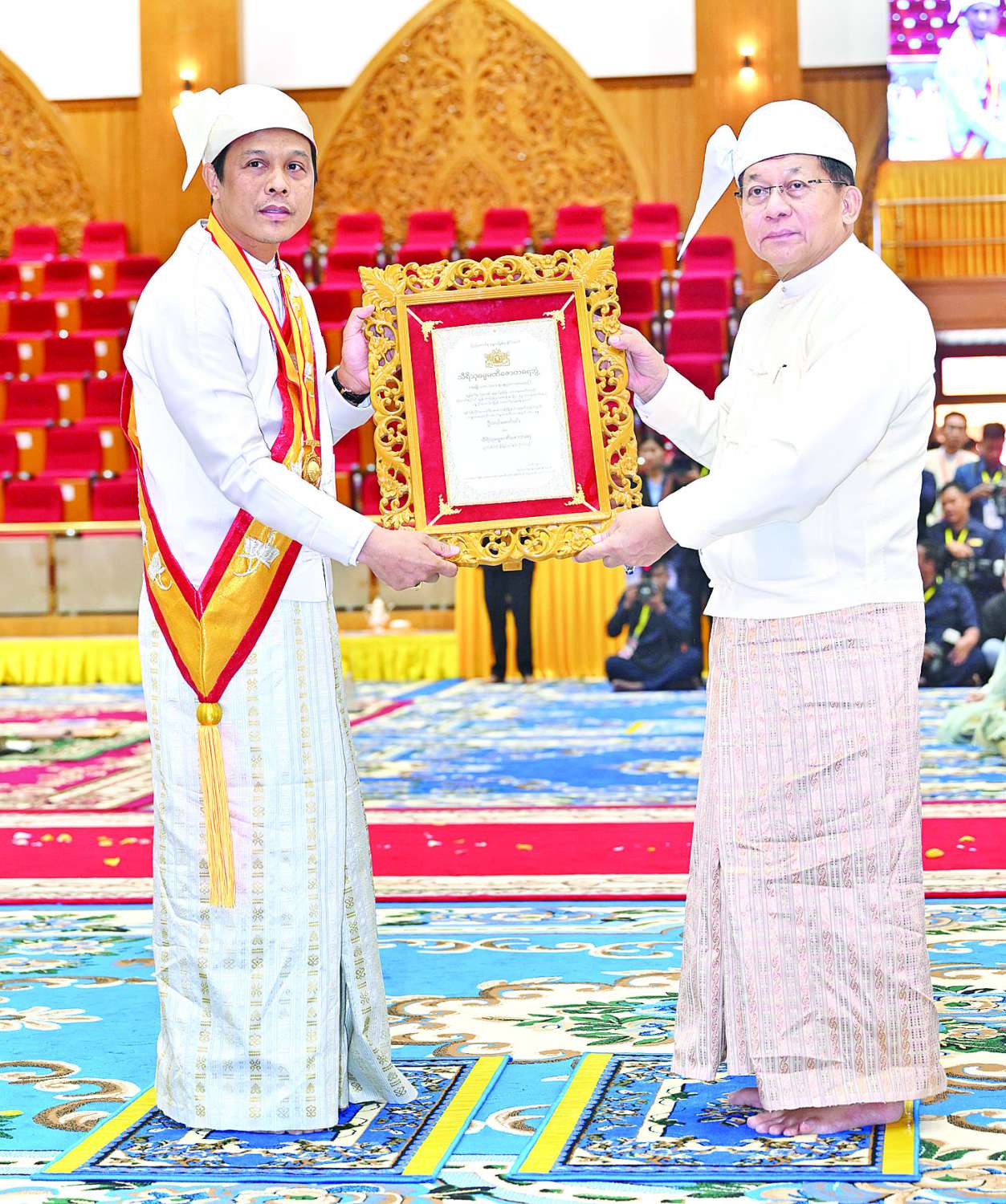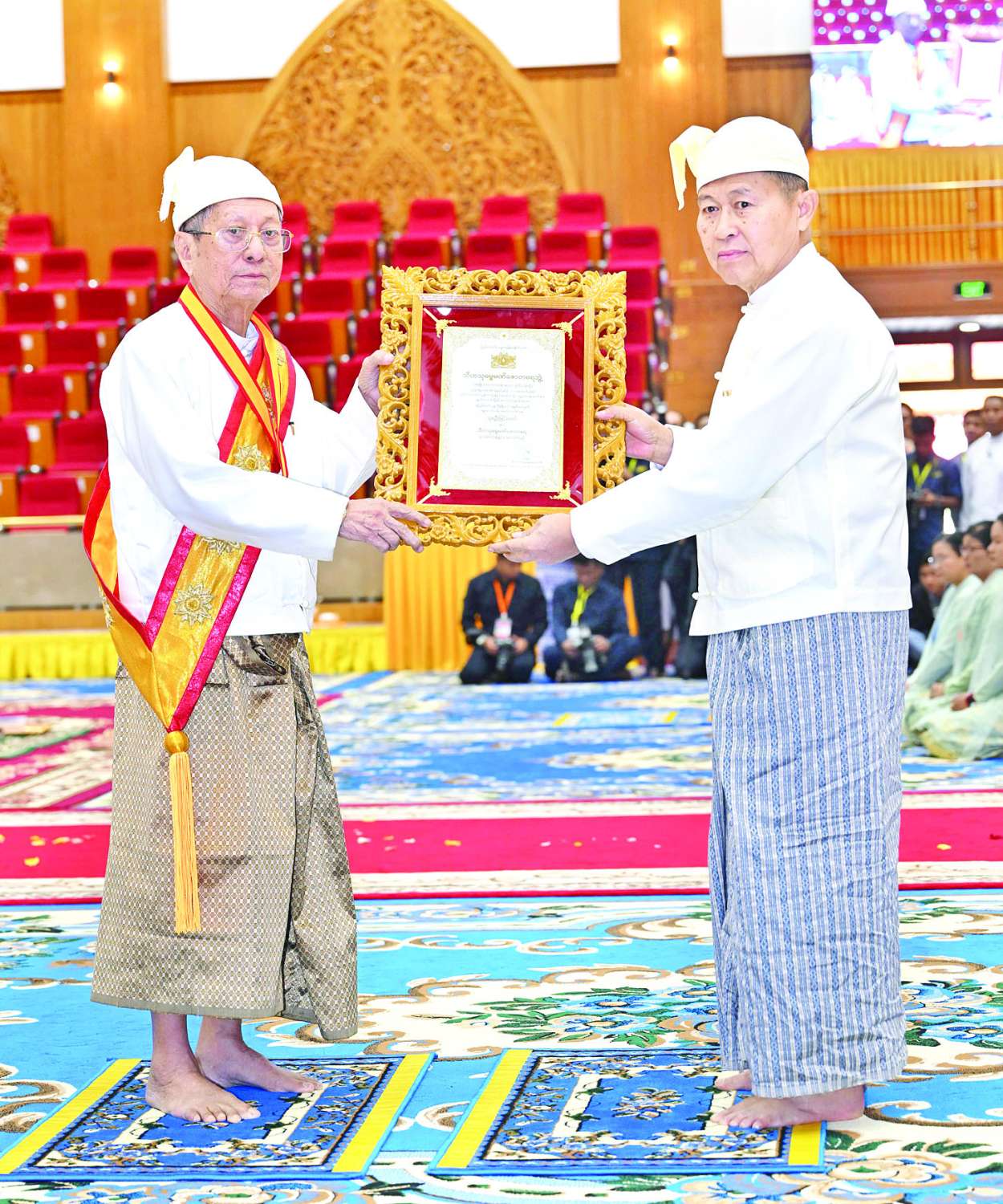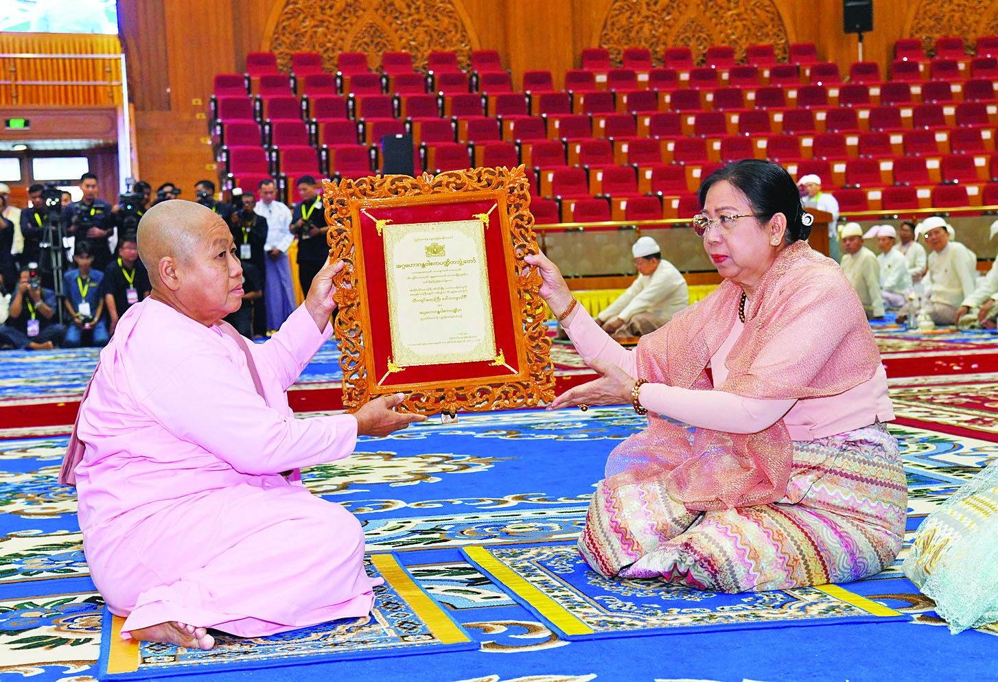 အခမ်းအနားသို့ နိုင်ငံတော်သံဃမဟာနာယကအဖွဲ့ဥက္ကဋ္ဌ အဘိဓဇမဟာရဋ္ဌဂုရု အဂ္ဂမဟာသဒ္ဒမ္မဇောတိကဓဇ သန်လျင်မင်းကျောင်း ဆရာတော် ဒေါက်တာဘဒ္ဒန္တ စန္ဒိမာဘိဝံသနှင့် နိုင်ငံတော်သံဃမဟာနာယကအဖွဲ့ အကျိုးတော်ဆောင်၊ မန္တလေးမြို့၊ မစိုးရိမ်တိုက်သစ်မဟာနာယက၊ ဓမ္မသမိဒ္ဓိကျောင်း ဆရာတော်အဂ္ဂမဟာပဏ္ဍိတ အဂ္ဂမဟာသဒ္ဓမ္မဇောတိကဓဇ မဟာဓမ္မကထိက ဗဟုဇနဟိတဓရ ဘဒ္ဒန္တဝါသေဋ္ဌာ ဘိဝံသတို့အမှူးပြုသည့် ၂၀၂၆ ခုနှစ်၊ သာသနာတော်ဆိုင်ရာဘွဲ့တံဆိပ်တော်များ ဆက်ကပ်ကော်ရော် အပူဇော်ခံတော်မူကြမည့် ပြည်တွင်း၊ ပြည်ပဆရာတော်၊ သံဃာတော်များနှင့် သီလရှင်ဆရာကြီးများ ကြွရောက်ချီးမြှင့်တော်မူကြပြီး နိုင်ငံတော်ယာယီ သမ္မတ နိုင်ငံတော်လုံခြုံရေးနှင့် အေးချမ်းသာယာရေးကော်မရှင်ဥက္ကဋ္ဌနှင့် ဇနီးတို့နှင့်အတူ ကော်မရှင်ဒုတိယဥက္ကဋ္ဌ ဒုတိယဗိုလ်ချုပ်မှူးကြီး စိုးဝင်းနှင့်ဇနီး ဒေါ်သန်းသန်းနွယ်၊ ကော်မရှင်အဖွဲ့ဝင် နိုင်ငံတော်ဝန်ကြီးချုပ် ဦးညိုစောနှင့်ဇနီး၊ ကော်မရှင်အဖွဲ့ဝင်အမှုဆောင်ချုပ် ဦးအောင်လင်းဒွေးနှင့်ဇနီး၊ ကော်မရှင်အတွင်းရေးမှူး ဗိုလ်ချုပ်ကြီး ရဲဝင်းဦးနှင့်ဇနီး၊ ကော်မရှင်အဖွဲ့ဝင်များနှင့် ဇနီးများ၊ ပြည်ထောင်စုအဆင့်ပုဂ္ဂိုလ်များ၊ ပြည်ထောင်စုဝန်ကြီးများနှင့် ဇနီးများ၊ နေပြည်တော်ကောင်စီဥက္ကဋ္ဌ၊ ကာကွယ်ရေးဦးစီးချုပ်ရုံးမှ အဆင့်မြင့်တပ်မတော်အရာရှိကြီးများနှင့် ဇနီးများ၊ နေပြည်တော်တိုင်းစစ်ဌာနချုပ် တိုင်းမှူးနှင့် တာဝန်ရှိသူများ၊ သာသနာနုဂ္ဂဟဘွဲ့တံဆိပ်ရ လူပုဂ္ဂိုလ်များ တက်ရောက်ကြည်ညိုကြသည်။
