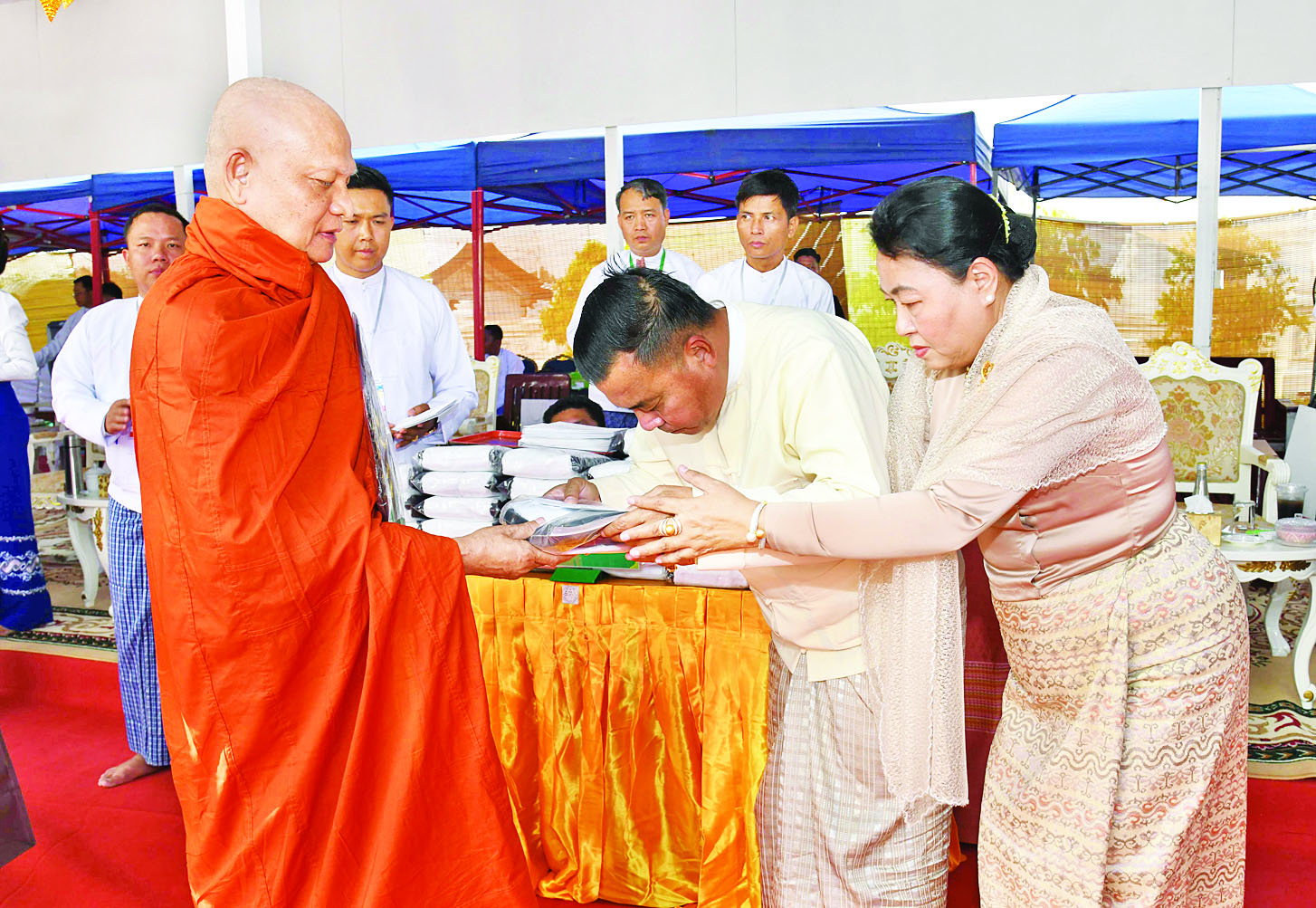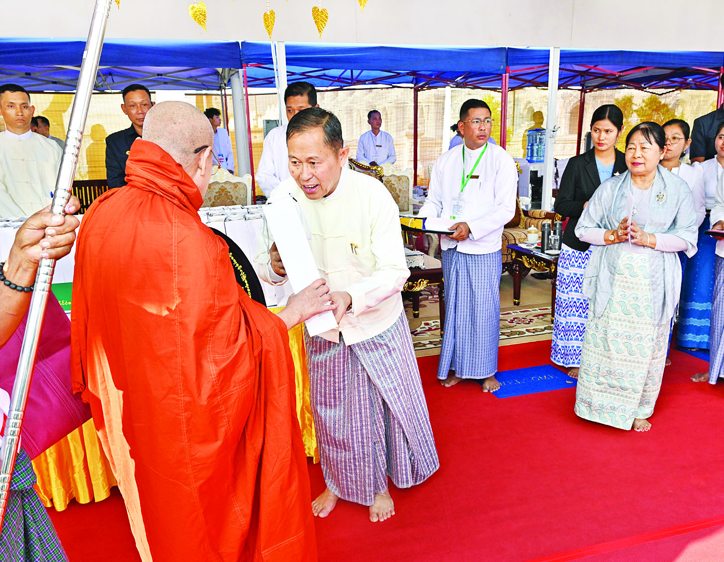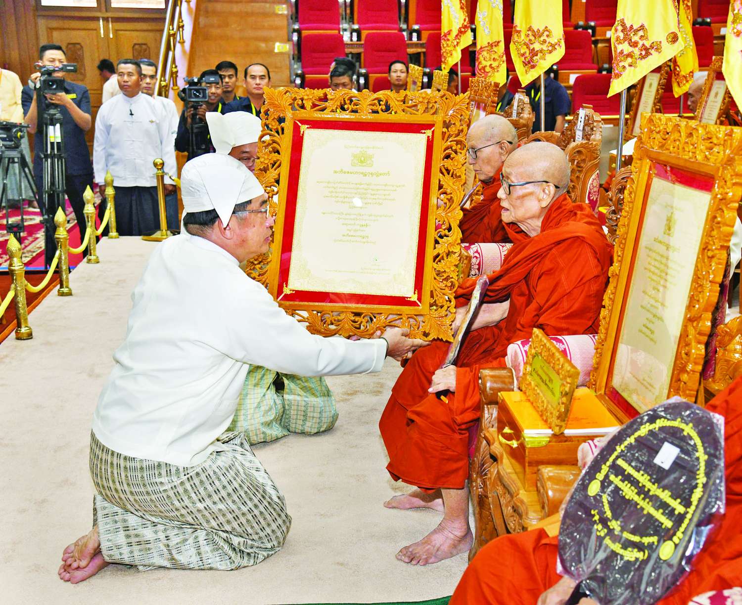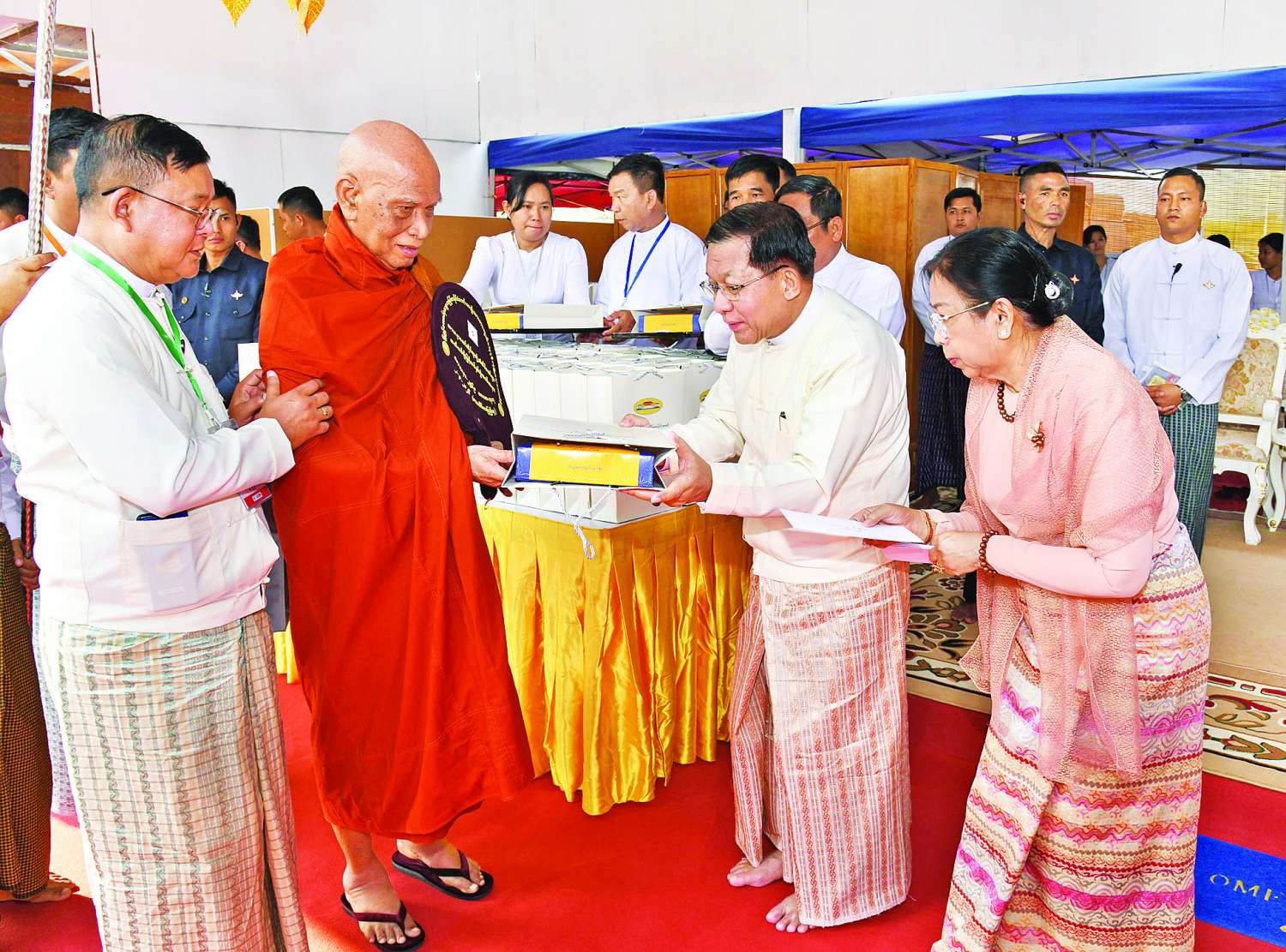 ဆက်လက်၍ ကော်မရှင်အဖွဲ့ဝင်များ၊ ပြည်ထောင်စုအဆင့်ပုဂ္ဂိုလ်များ၊ ပြည် ထောင်စုဝန်ကြီးများ၊ ကာကွယ်ရေးဦးစီးချုပ်ရုံးမှ အဆင့်မြင့်တပ်မတော်အရာရှိကြီးများနှင့် တာဝန်ရှိသူများက အဘိဓဇအဂ္ဂမဟာ သဒ္ဓမ္မ ဇောတိက၊ အဂ္ဂမဟာ ပဏ္ဍိတ၊ အဂ္ဂမဟာ သဒ္ဓမ္မဇောတိကဓဇ၊ အဂ္ဂမဟာ ဂန္ထဝါစက ပဏ္ဍိတ၊ အဂ္ဂမဟာ ကမ္မဋ္ဌာနာ စရိယဘွဲ့ရရှိသည့် ဆရာတော်ကြီးများထံ ဘွဲ့တံဆိပ်တော်နှင့် အဆောင်အယောင်များကို ဆက်ကပ်ပူဇော်ကြသည်။