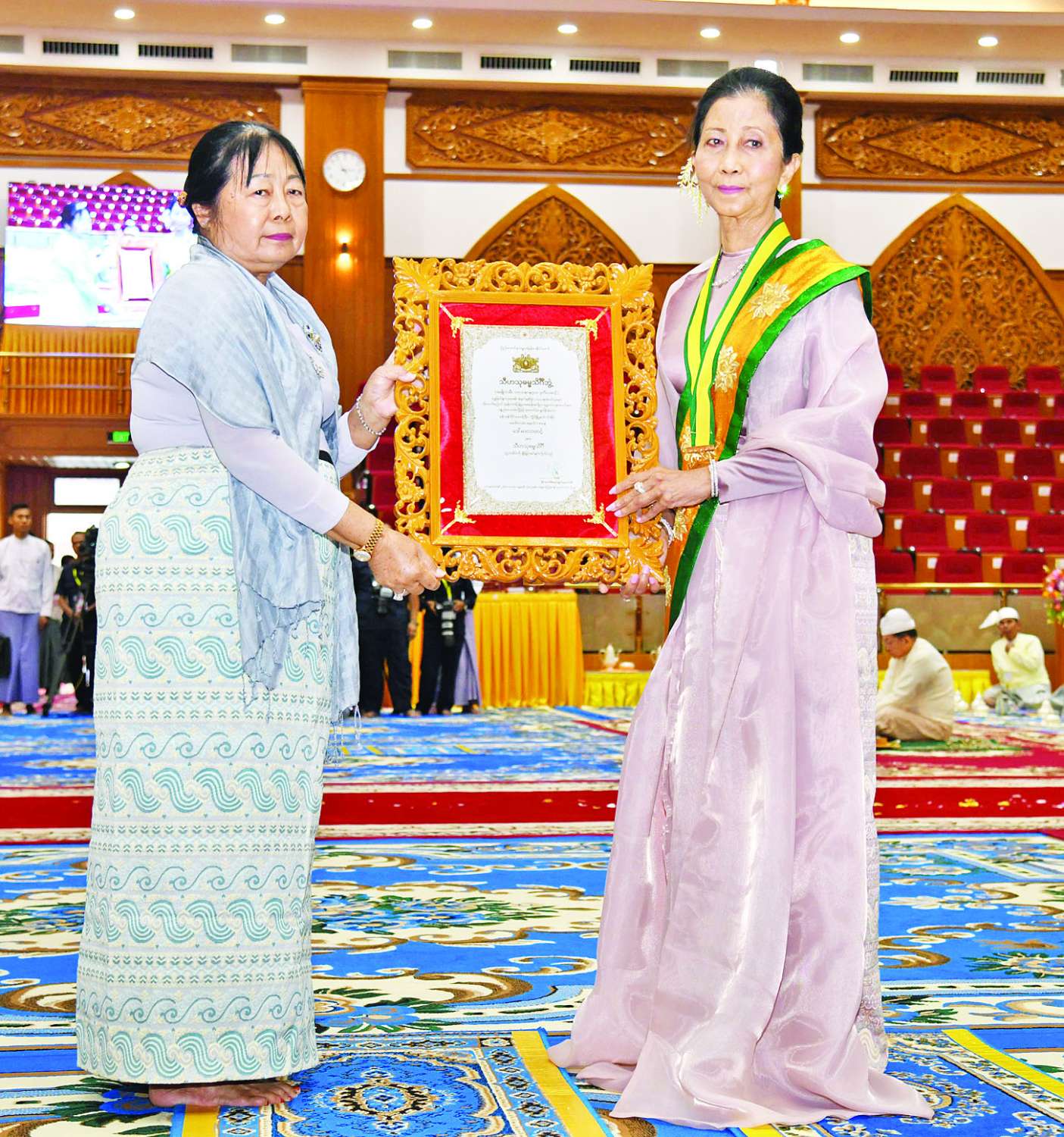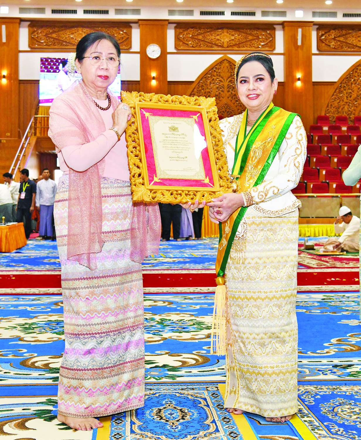 ထို့နောက် နိုင်ငံတော်ယာယီသမ္မတ နိုင်ငံတော်လုံခြုံရေးနှင့်အေးချမ်းသာယာရေးကော်မရှင်ဥက္ကဋ္ဌ၏ဇနီးက အဂ္ဂမဟာသီရိသုဓမ္မသိင်္ဂီ ဘွဲ့ရရှိကြသည့် ဒေါက်တာဌေးဌေးခိုင်၊ ဒေါ်ဌေးဌေးဝင်း၊ ဒေါ်ညွန့်ယဉ်ဝင်း၊ ဒေါ်သီတာအောင်၊ သီရိသုဓမ္မသိင်္ဂီ ဘွဲ့ရရှိကြသည့် ဒေါ်နန်းအေခန့်၊ ဒေါ်ခင်သီတာ၊ သီဟသုဓမ္မသိင်္ဂီ ဘွဲ့ရရှိကြသည့် ဒေါ်စမ်းစမ်းအေး၊ ဒေါ်ဥမ္မာမြင့်၊ ဒေါ်နီလာ၊ ဒေါ်ဝါဝါသင်း၊ ဒေါ်သဉ္ဇာဝင်းစိန်၊ ဒေါက်တာ ဒေါ်နန်းကူးကူ၊ ဒေါ်သီတာလွင်တို့အားလည်းကောင်း၊ ကော်မရှင်ဒုတိယဥက္ကဋ္ဌ၏ဇနီးက သီဟသုဓမ္မသိင်္ဂီဘွဲ့ရရှိကြသည့် ဒေါ်တင်မိုးနွယ်၊ ဒေါက်တာအေးခိုင်ညွန့်၊ ဒေါ်ခင်နှင်းဝေ၊ ဒေါ်မာလာတင့်၊ ဒေါက်တာဒေါ်တင်လင်းမြင့်၊ ဒေါ်ခင်လေးမြင့်၊ ဒေါ်ခင်လှဝင်း၊ ဒေါ်စုညွန့်ဦး၊ ဒေါ်သန်းသန်းအေး၊ ဒေါက်တာနန္ဒာမွှန်းနှင့် ဒေါ်ကြူကြူစိုးတို့အားလည်းကောင်း ဘွဲ့တံဆိပ်နှင့် အဆောင်အယောင်များကို ချီးမြှင့်အပ်နှင်းသည်။