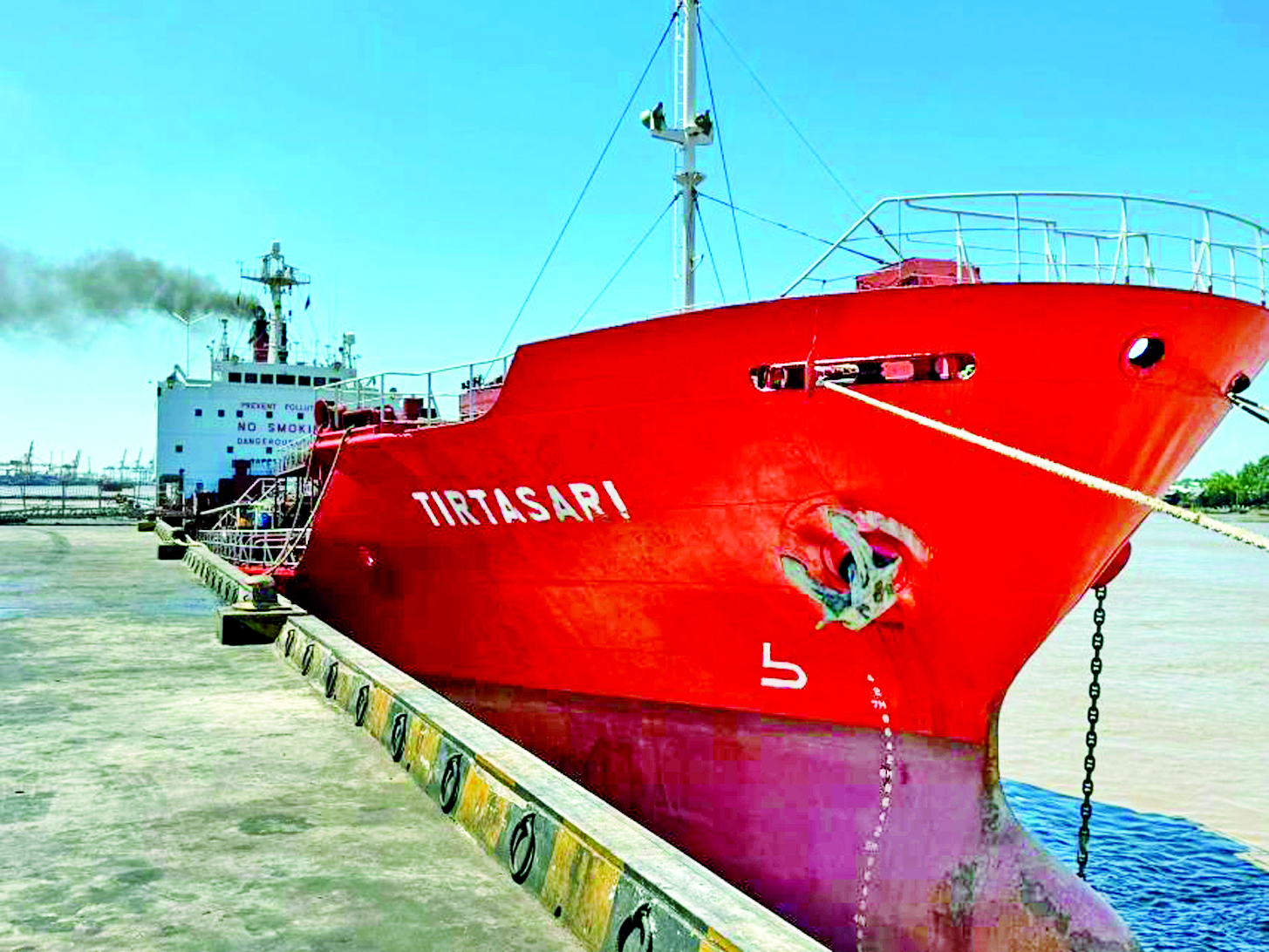 ပြည်တွင်းစားသုံးဆီဖူလုံမှုရှိစေရန်နှင့် စက်မှုကုန်ထုတ်လုပ်ငန်းများအတွက် လိုအပ်သောကုန်ကြမ်းများ အချိန်မီဖြန့်ဖြူးနိုင်ရန်ရည်ရွယ်၍ MT TIRTASARI အမည်ရှိ ဆီတင်သင်္ဘောကြီးသည် ရန်ကုန်မြို့ (K.I.P Port) သို့ မတ် ၂၁ ရက်ညပိုင်းက ဆိုက်ကပ်ရောက်ရှိခဲ့ကြောင်း သိရသည်။