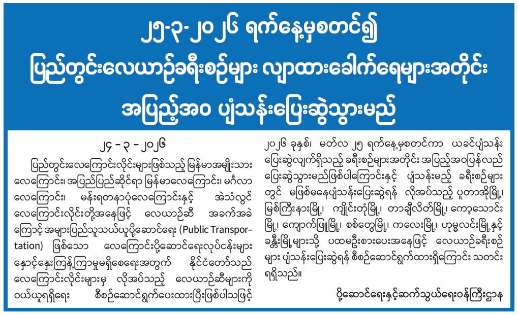 ၂၅-၃-၂၀၂၆ ရက်နေ့မှစတင်၍ ပြည်တွင်းလေယာဉ်ခရီးစဉ်များ လျာထားခေါက်ရေများအတိုင်း အပြည့်အဝ ပျံသန်းပြေးဆွဲသွားမည် 03/25/2026