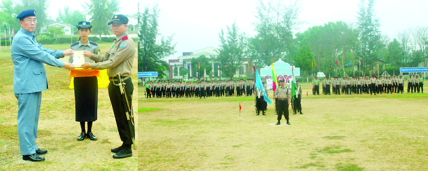သင်တန်း ဆင်းပွဲတွင် ပါမောက္ခချုပ်က သင်တန်းကာလအတွင်း ဆုရရှိသူများအား ဆုများ ချီးမြှင့်ရာ သင်တန်းသားစံပြဆုကိုဦးမျိုးဇော် ဦးစီးအရာရှိ မီးသတ်ဦးစီးဌာန ပြည်ထဲရေးဝန်ကြီးဌာန အားလည်းကောင်း၊ သင်တန်းသူ စံပြဆုကို ဒေါက်တာမိုးဆမ်းပန်း၊ ဦးစီးအရာရှိ မွေးမြူရေးနှင့်ကုသရေးဦးစီးဌာန စိုက်ပျိုးရေး၊ မွေးမြူရေးနှင့်ဆည်မြောင်းဝန်ကြီးဌာနအားလည်းကောင်း၊ စာပေထူးချွန်ဆုနှင့် စစ်ရေးပြထူးချွန်ဆုကို ဦးအောင်ကျော်ဖြိုး လက်ထောက် အင်ဂျင်နီယာရေအရင်းအမြစ်နှင့် မြစ်ချောင်းများ ဖွံ့ဖြိုးတိုးတက်ရေးဦးစီးဌာန ပို့ဆောင်ရေးနှင့်ဆက်သွယ်ရေးဝန်ကြီးဌာနအားလည်းကောင်း၊ စစ်ရေးပြထူးချွန်ဆုကို ဒေါ်ဆုဇင်မာလွင် ဦးစီးအရာရှိ စီမံကိန်းရေးဆွဲရေးဦးစီးဌာန အမျိုးသားစီမံကိန်းဝန်ကြီးဌာန အားလည်းကောင်း၊ သေနတ်ပစ်ထူးချွန်ဆုကို ဒုတိယရဲမှူးအောင်မြင့်မြတ် မြန်မာနိုင်ငံရဲတပ်ဖွဲ့ ပြည်ထဲရေးဝန်ကြီးဌာနအားလည်းကောင်း၊ သင်တန်းဆင်းအောင်လက်မှတ်များကိုလည်းကောင်း ချီးမြှင့်ပေးပြီး သင်တန်းဆင်းအမှာစကားပြောကြားသည်။