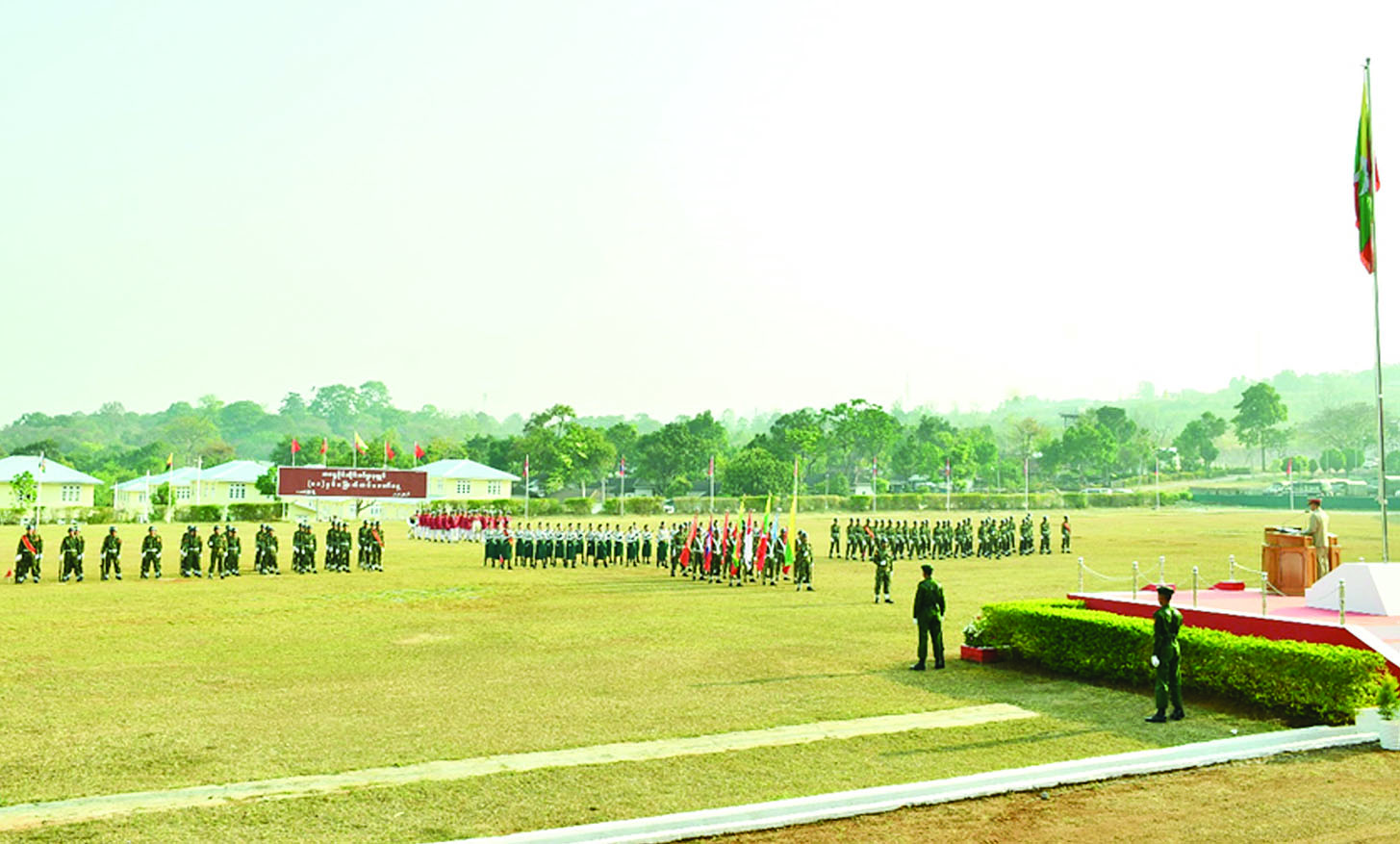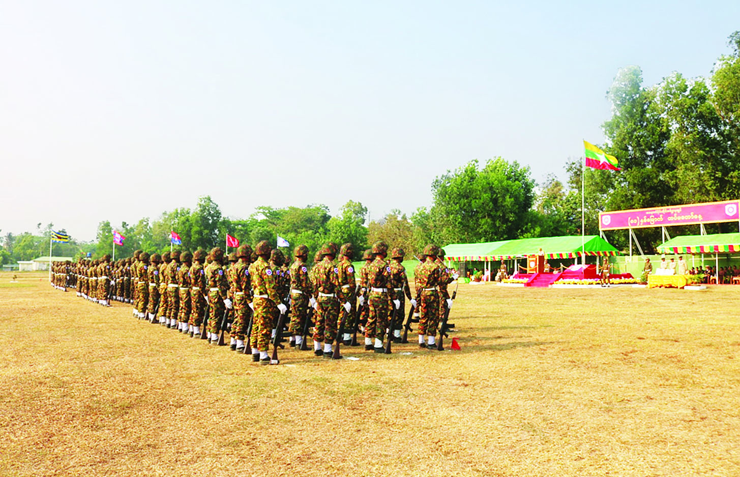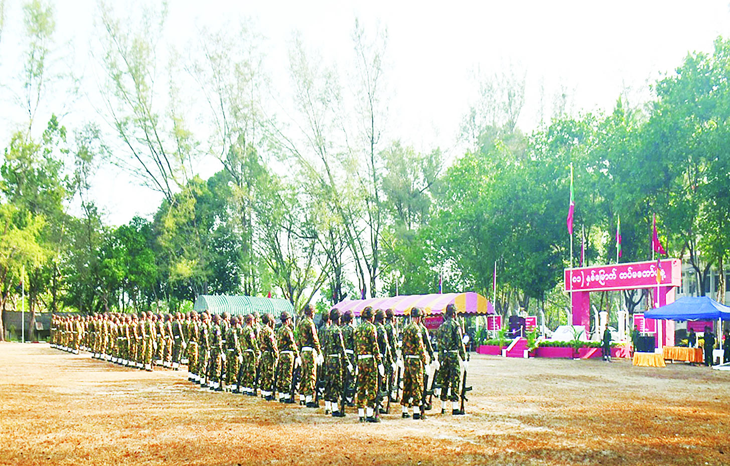 အဆိုပါ စစ်ရေးပြအခမ်းအနားသို့ သက်ဆိုင်ရာ တိုင်းဒေသကြီးနှင့် ပြည်နယ်ဝန်ကြီးချုပ်များ၊ တိုင်းမှူးများ၊ ဌာနဆိုင်ရာတာဝန်ရှိသူများ၊ အရာရှိ၊ စစ်သည်၊ မိသားစုဝင်များ၊ စစ်မှုထမ်းဟောင်းအဖွဲ့ဝင်များ၊ ပြည်သူ့စစ် (ဌာနေ) တပ်ဖွဲ့ဝင်များနှင့် ဖိတ်ကြားထားသည့် ဧည့်သည်တော်များတက်ရောက်ကြပြီး တိုင်းစစ်ဌာနချုပ်များအလိုက် တိုင်းမှူးများနှင့် တာဝန်ရှိသူများက တက်ရောက်မိန့်ခွန်းပြောကြားကာ စစ်ရေးပြအစီအစဉ်အတိုင်း ဆောင်ရွက်ကြသည်။