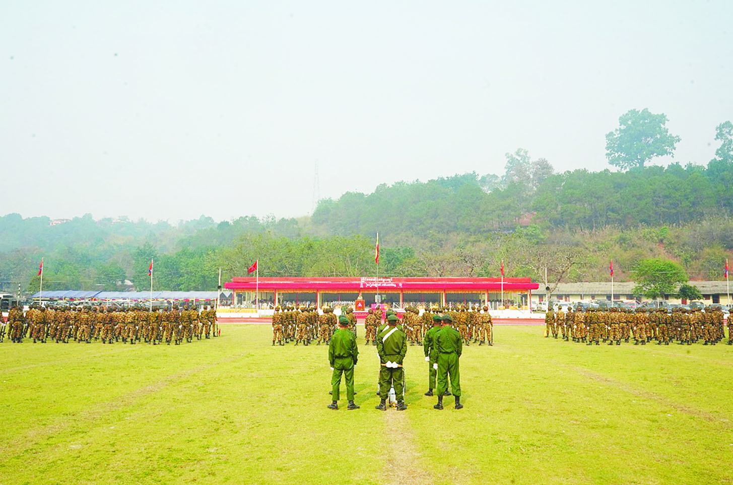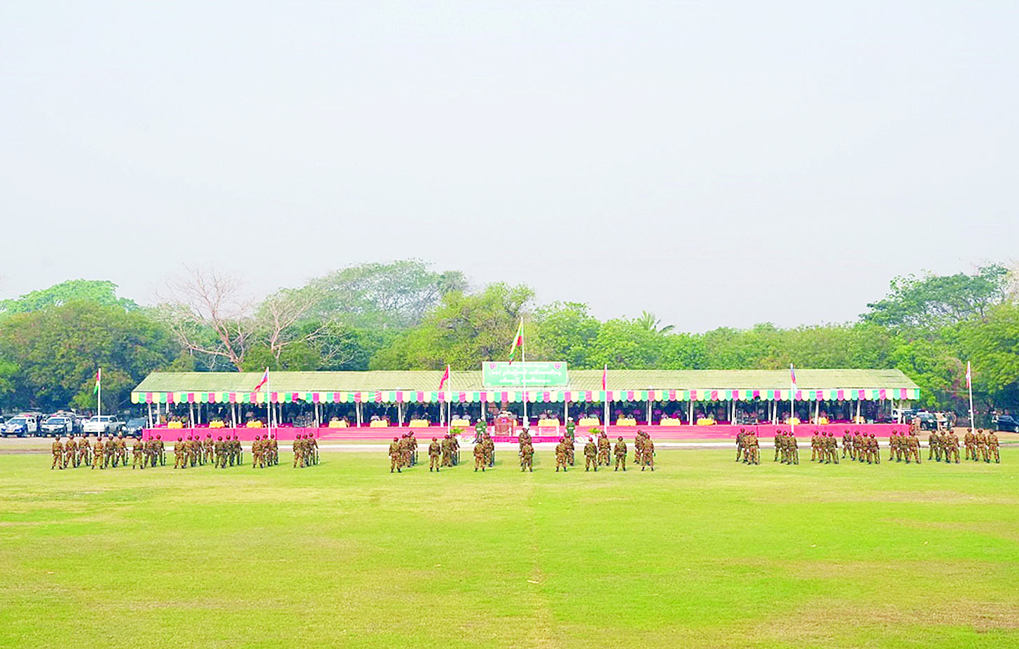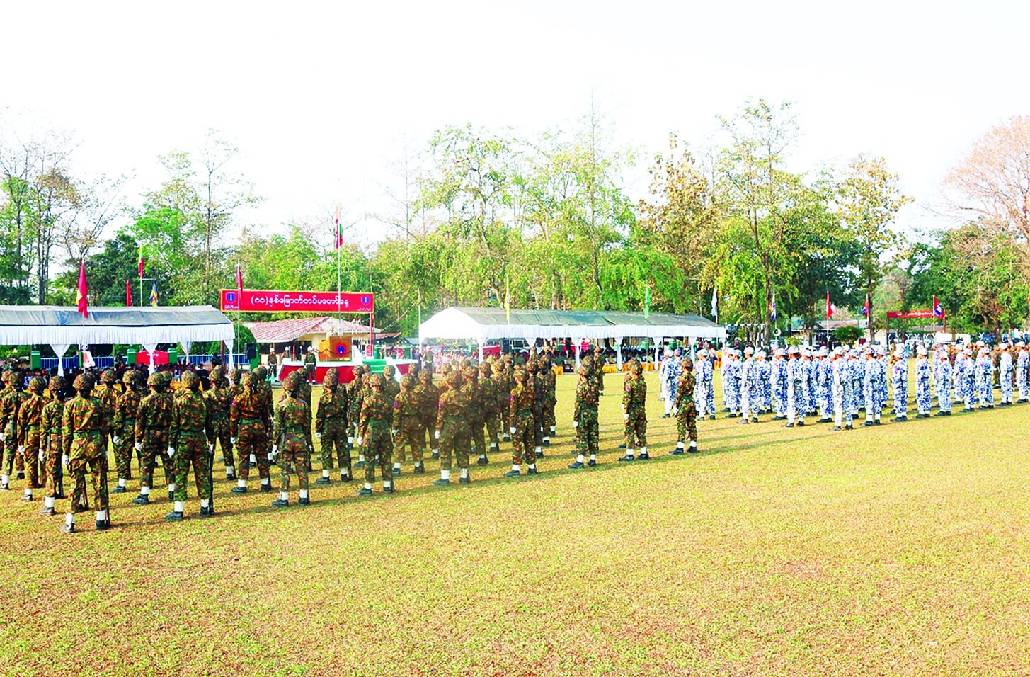 အဆိုပါ စစ်ရေးပြအခမ်းအနားသို့ သက်ဆိုင်ရာ တိုင်းဒေသကြီးနှင့် ပြည်နယ်ဝန်ကြီးချုပ်များ၊ တိုင်းမှူးများ၊ ဌာနဆိုင်ရာတာဝန်ရှိသူများ၊ အရာရှိ၊ စစ်သည်၊ မိသားစုဝင်များ၊ စစ်မှုထမ်းဟောင်းအဖွဲ့ဝင်များ၊ ပြည်သူ့စစ် (ဌာနေ) တပ်ဖွဲ့ဝင်များနှင့် ဖိတ်ကြားထားသည့် ဧည့်သည်တော်များတက်ရောက်ကြပြီး တိုင်းစစ်ဌာနချုပ်များအလိုက် တိုင်းမှူးများနှင့် တာဝန်ရှိသူများက တက်ရောက်မိန့်ခွန်းပြောကြားကာ စစ်ရေးပြအစီအစဉ်အတိုင်း ဆောင်ရွက်ကြသည်။