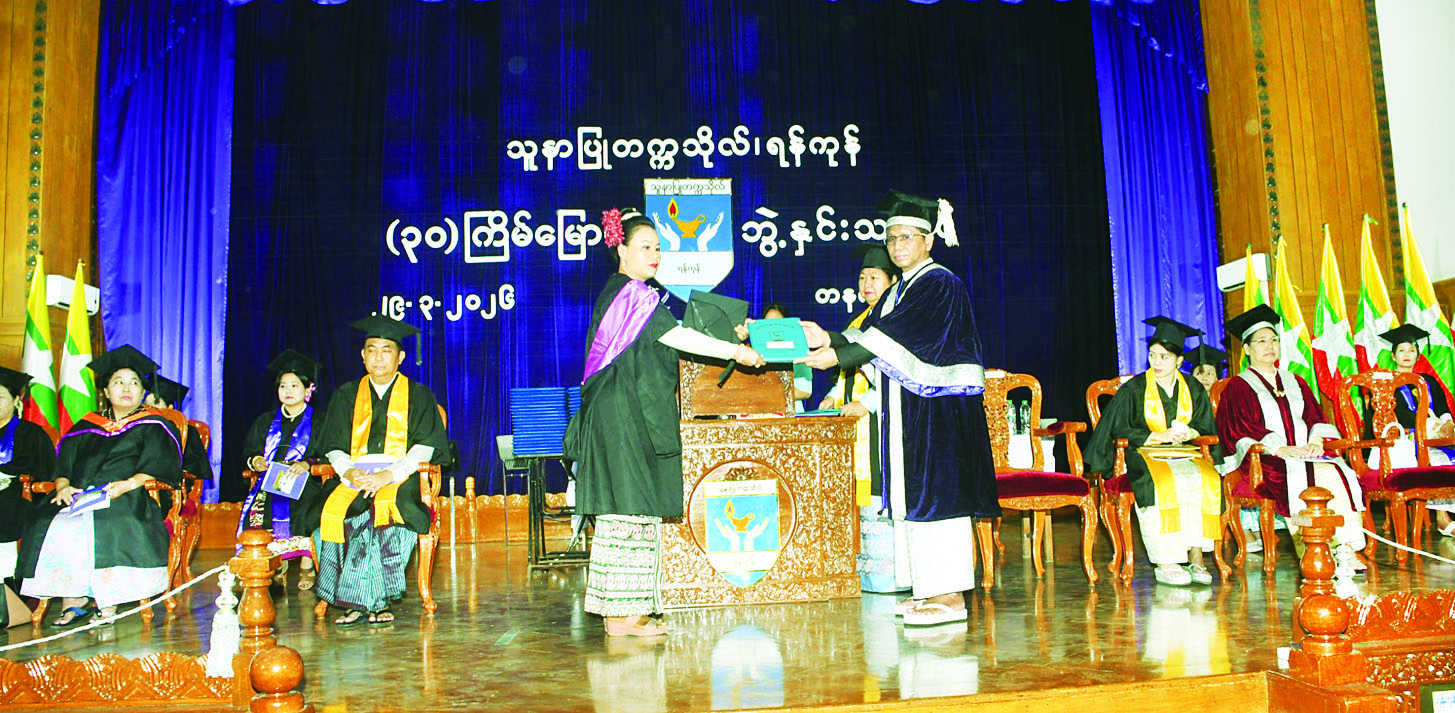 ထို့နောက် ဘွဲ့ရကျောင်းသား ကျောင်းသူများက သူနာပြုသစ္စာ အဓိဋ္ဌာန်ကို ရွတ်ဆိုကြပြီး သူနာပြုပါရဂူဘွဲ့၊ သူနာပြုမဟာသိပ္ပံဘွဲ့၊ အထူးသူနာပြု ဒီပလိုမာဘွဲ့နှင့် သူနာပြုသိပ္ပံဘွဲ့များအတွက် ကောင်းစွာအောင်မြင် ပေါက်မြောက်ခဲ့ပြီဟု ပညာရေးအဖွဲ့က ကြေညာခြင်းခံကြရသူများအား သူနာပြုတက္ကသိုလ် ရန်ကုန်ပါမောက္ခချုပ်က ဘွဲ့များအပ်နှင်းကာအမှာ စကားပြောကြားသည်။