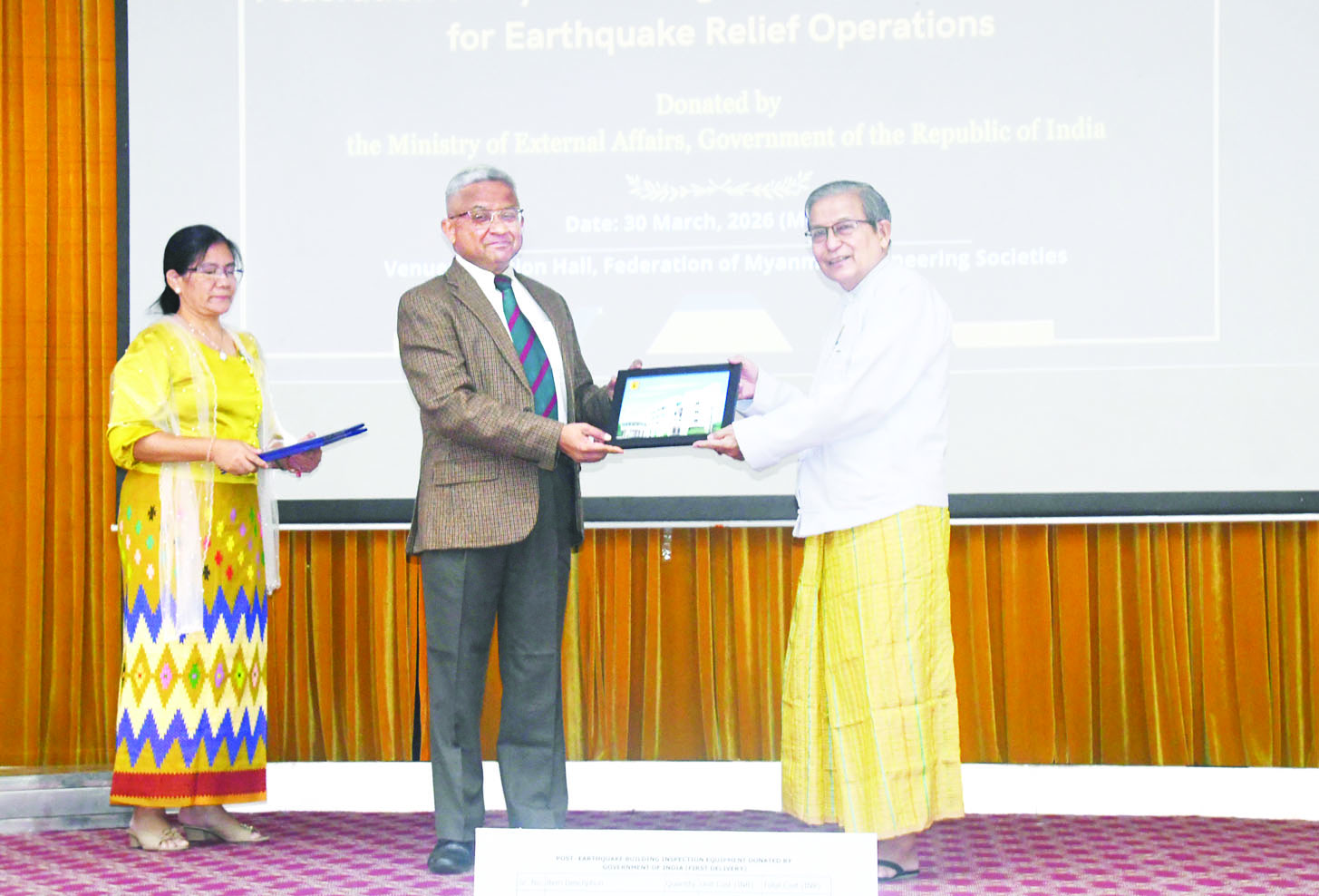 အိန္ဒိယသမ္မတနိုင်ငံမှ မြန်မာနိုင်ငံအင်ဂျင်နီယာအသင်းချုပ်သို့ ပေးပို့လှူဒါန်းသည့် ငလျင်အပြီး အဆောက်အအုံများ စစ်ဆေးရန် အသုံးပြုမည့် ကိရိယာများ လွှဲပြောင်းပေးအပ်ပွဲကို ယနေ့ နံနက် ၁၁ နာရီက ရန်ကုန်မြို့ လှိုင်မြို့နယ် မြန်မာနိုင်ငံအင်ဂျင်နီယာအသင်းချုပ်ရှိ Function Hall၌ ကျင်းပသည်။