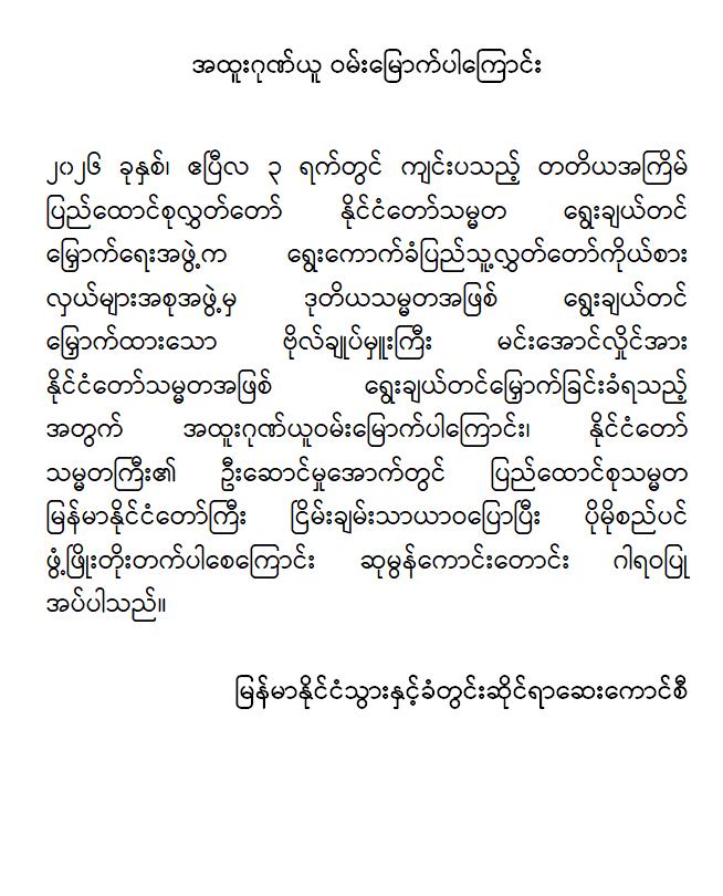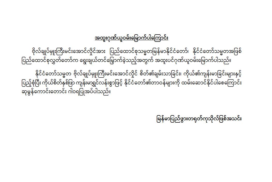 အဆိုပါ ထုတ်ပြန်ကြေညာချက်များတွင် ပြည်ထောင်စုသမ္မတမြန်မာနိုင်ငံတော်၊ နိုင်ငံတော်သမ္မတအဖြစ် ဗိုလ်ချုပ်မှူးကြီး မင်းအောင်လှိုင်အား ပြည်ထောင်စုလွှတ်တော်က ရွေးချယ်တင်မြှောက်ခဲ့သည့်အတွက် အထူးဂုဏ်ယူဝမ်းမြောက်မိပါကြောင်း၊ နိုင်ငံတော်သမ္မတကြီးနှင့် အစိုးရအဖွဲ့သစ်အနေဖြင့် ပါတီစုံဒီမိုကရေစီစနစ်သို့ ညင်သာအောင်မြင်စွာ ကူးပြောင်းနိုင်ပြီး ပြည်သူသာအမိ၊ ပြည်သူသာအဖဆိုသည့် မူဝါဒနှင့်အညီ ပြည်သူလူထုအမှန်တကယ် လိုလားတောင်းတနေသော ထာဝရငြိမ်းချမ်းရေး၊ တရားဥပဒေစိုးမိုးရေး၊ လူမှုစီးပွားဘဝ မြှင့်တင်ရေးနှင့် “ကမ္ဘာမှာ မြန်မာဟေ့” လို့ ရင်ပေါင်တန်းနိုင်ရန် အောင်မြင်စွာဖြတ်သန်းနိုင်ပြီး နာယကဂုဏ်(၆)ပါးနှင့်အညီ ကျင့်ကြံအုပ်ချုပ်နိုင်ပါမည်ဟု အပြည့်အဝအားကိုးယုံကြည်ပါကြောင်း၊ နိုင်ငံတော်သမ္မတ ဗိုလ်ချုပ်မှူးကြီးမင်းအောင်လှိုင် စိတ်၏ချမ်းသာခြင်း၊ ကိုယ်၏ကျန်းမာခြင်းများနှင့်ပြည့်စုံပြီး ကိုယ်စိတ်နှစ်ဖြာကျန်းမာရွှင်လန်းစွာဖြင့် နိုင်ငံတော်၏တာဝန်များကို ထမ်းဆောင်နိုင်ပါစေကြောင်း ဆုမွန်ကောင်းတောင်း ဂါရဝပြုအပ်ပါကြောင်း၊ ပြည်ထောင်စုသမ္မတ မြန်မာနိုင်ငံတော်ကြီး ငြိမ်းချမ်းသာယာဝပြောပြီး ပိုမိုစည်ပင်ဖွံ့ဖြိုး တိုးတက်ပါစေကြောင်း စသည်ဖြင့် ပါရှိကြောင်းသိရှိရသည်။
