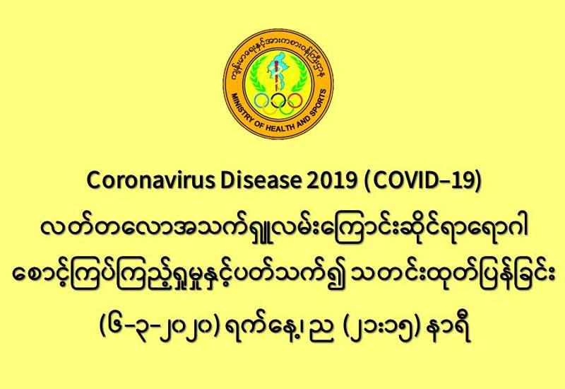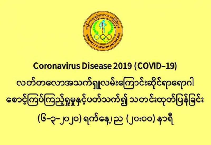၁။ ကျန်းမာရေးနှင့်အားကစားဝန်ကြီးဌာနသည် တရုတ်ပြည်သူ့သမ္မတနိုင်ငံနှင့် ကမ္ဘာ့နိုင်ငံ (၈၅) နိုင်ငံတွင် ကူးစက်ပျံ့နှံ့လျက်ရှိသည့် COVID-19 လတ်တလော အသက်ရှူလမ်းကြောင်းဆိုင်ရာ ရောဂါဖြစ်ပွားမှုဖြစ်စဉ်နှင့် ပတ်သက်၍ ရောဂါစောင့်ကြပ်ကြည့်ရှုခြင်း လုပ်ငန်းများအား အပြည်ပြည် ဆိုင်ရာ ဝင်ပေါက်၊ ထွက်ပေါက်ဂိတ်များတွင်လည်းကောင်း၊ ဆေးရုံအခြေပြုအဖြစ်လည်းကောင်း၊ ပြည်သူ လူထုအခြေပြု စောင့်ကြပ်ကြည့်ရှုခြင်း လုပ်ငန်းများဖြင့်လည်းကောင်း၊ ပုဂ္ဂလိကဆေးရုံများ နှင့် ပူးပေါင်း၍လည်းကောင်း ဆောင်ရွက်လျက်ရှိပါသည်။